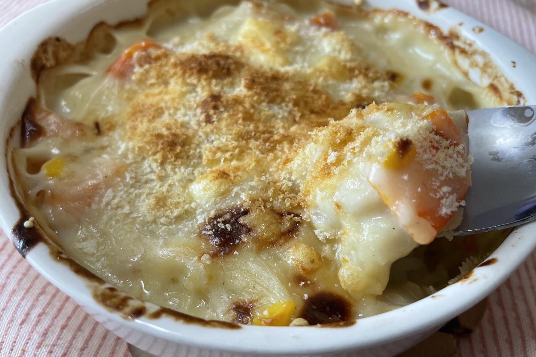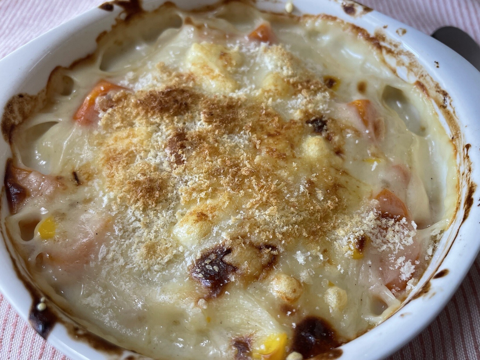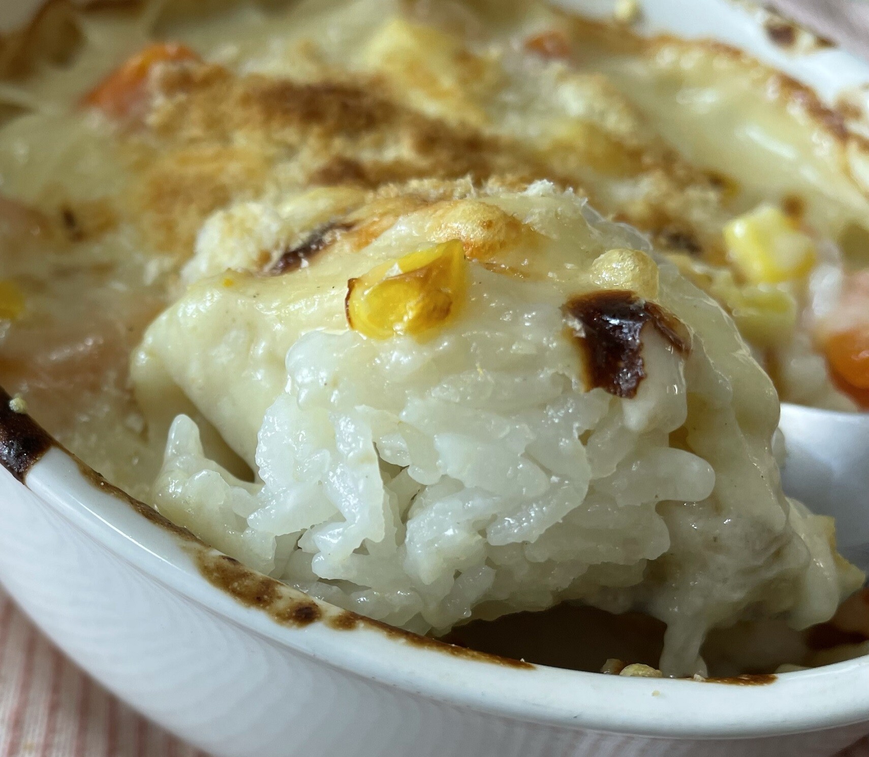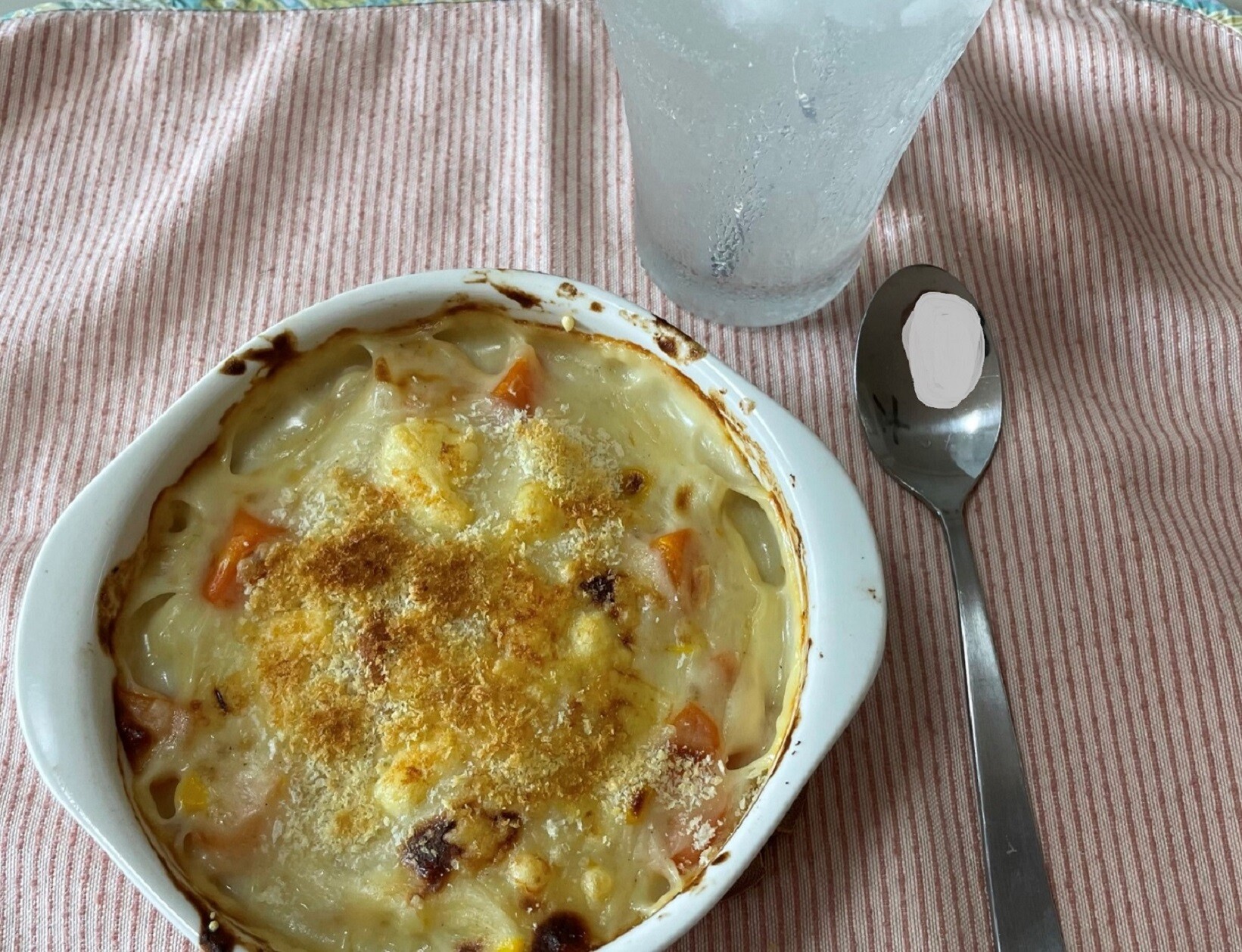 本当に簡単に作りました、グラタン皿にごはんを入れてシチューを掛けてチーズとパン粉をふりかけてトースターに入れて放置するだけですもん・・・