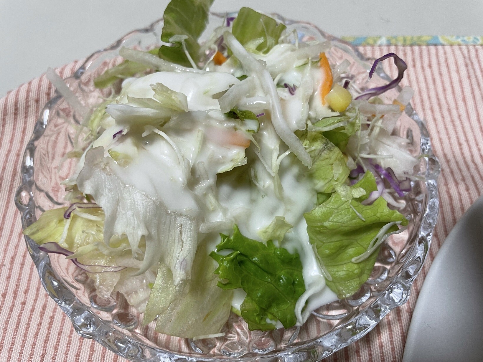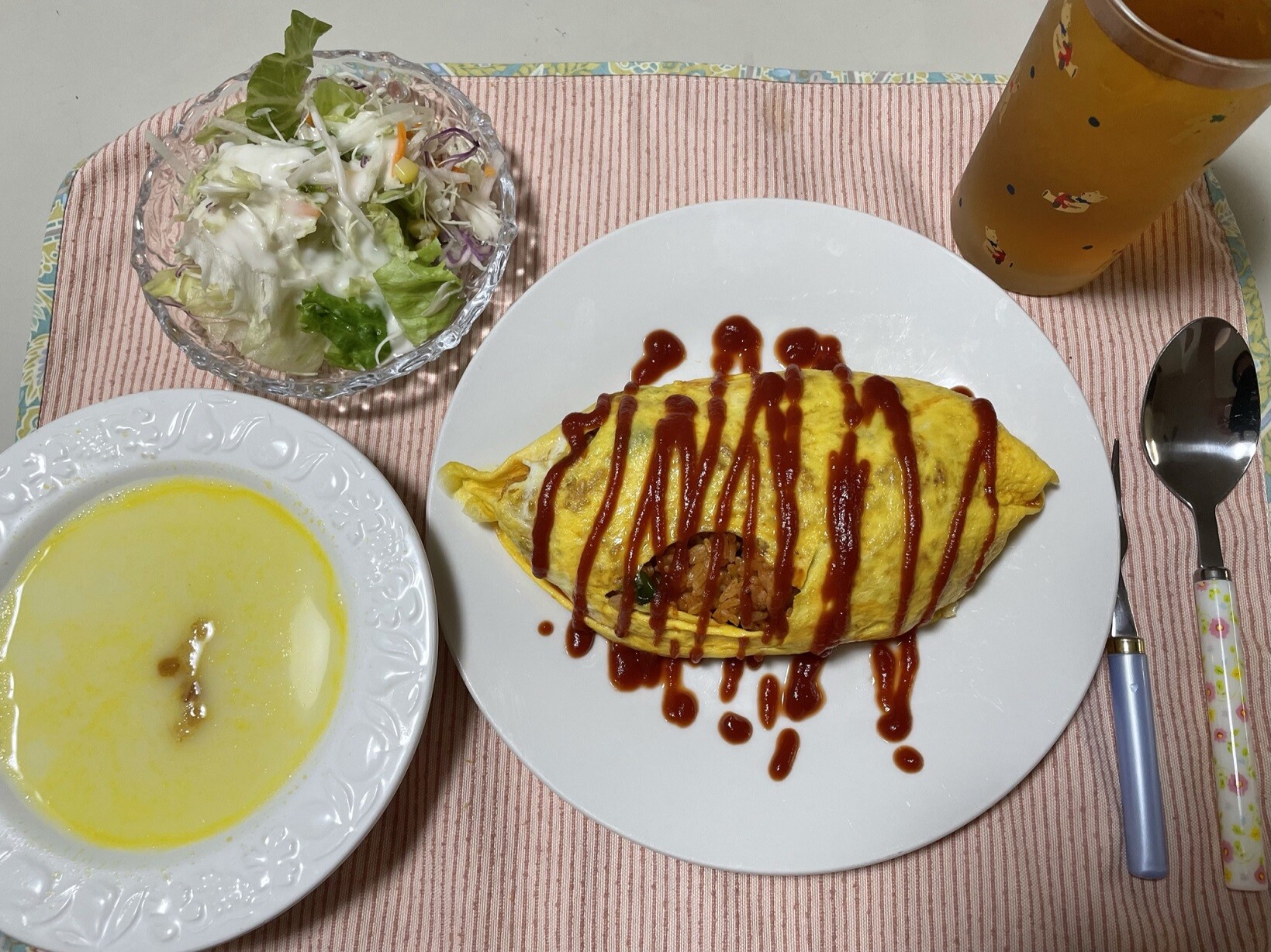 触らんかったら良かったぁ~~Σ( ̄ロ ̄lll)ガーンサラダとスープも用意しました、破れたオムライスをメインにするのやめようかな、この上にケチャップじゃなくてシチューをかければ良かったかも。。。