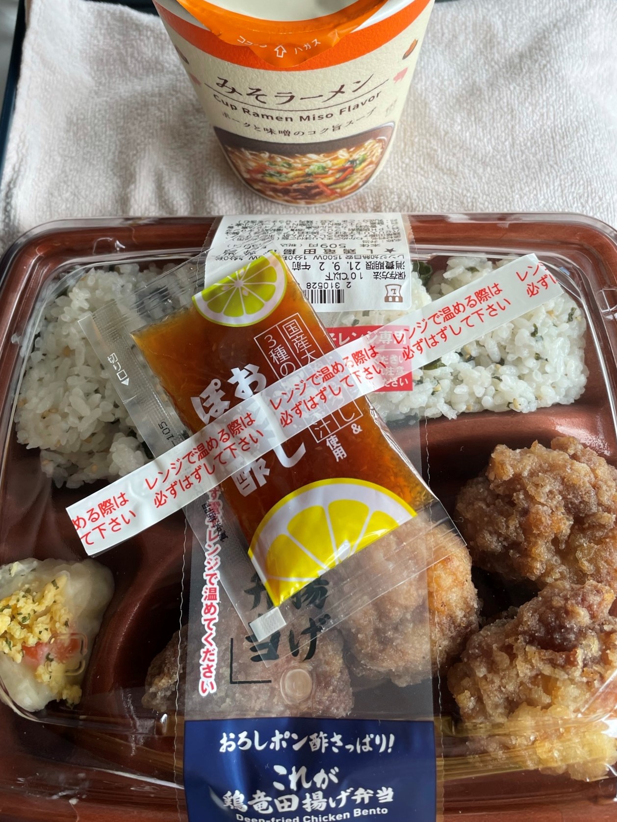 色々と弁当はあったのですが、なんとなく、これが何々弁当だシリーズが気になって、その中の竜田揚げ弁当をチョイスしたんです、ハンバーグと生姜焼きも最後まで悩んだのですが、鶏肉好きなので結果こうなりました(〇`・Д・ ウンウン味噌味のカップ麺は普通でした、竜田揚げ弁当も悪くはないですけど、ずば抜けて美味しいとも言い難いですね、個人的な感想はもうちょっと衣が薄い方が好みかな・・・