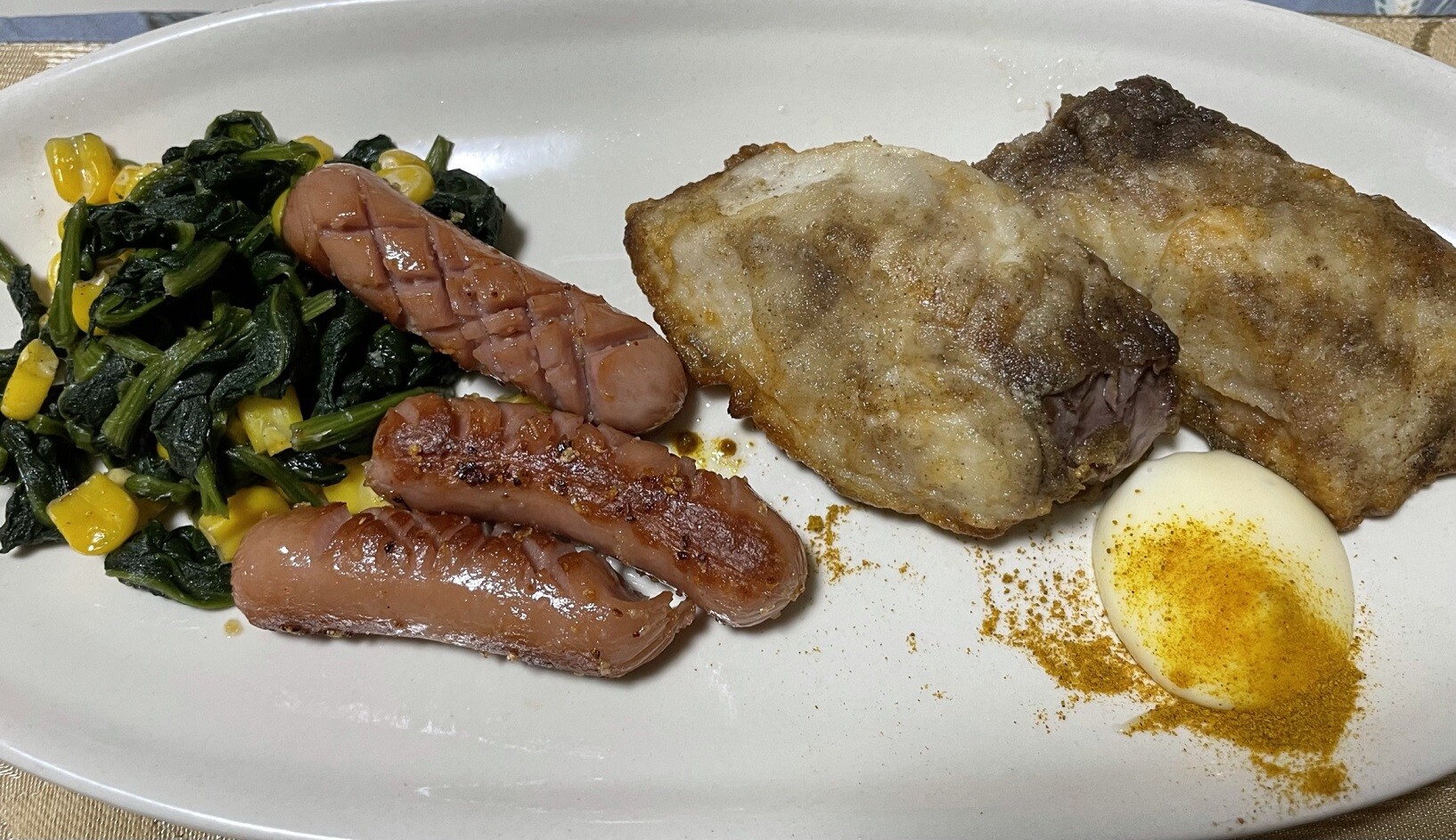 シイラの切身があるのでムニエルにしてカレーマヨを添えました、その横にはウインナーとほうれん草のソティーを付けましたよ、サラダとスープとライスも用意して頂きましょう!!