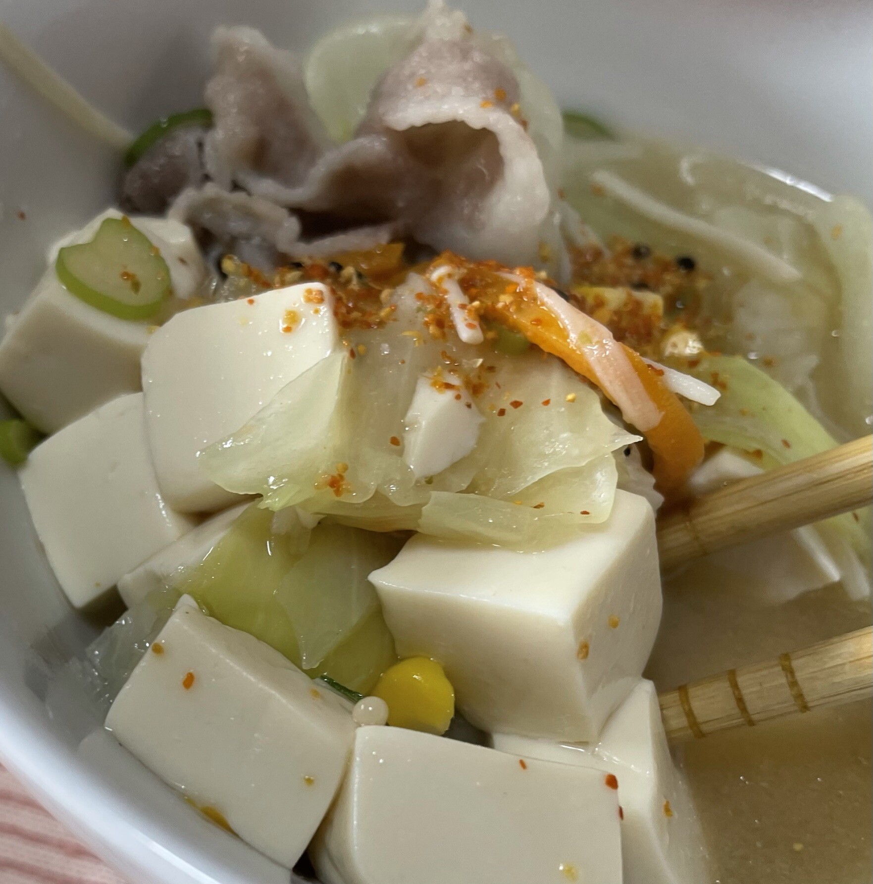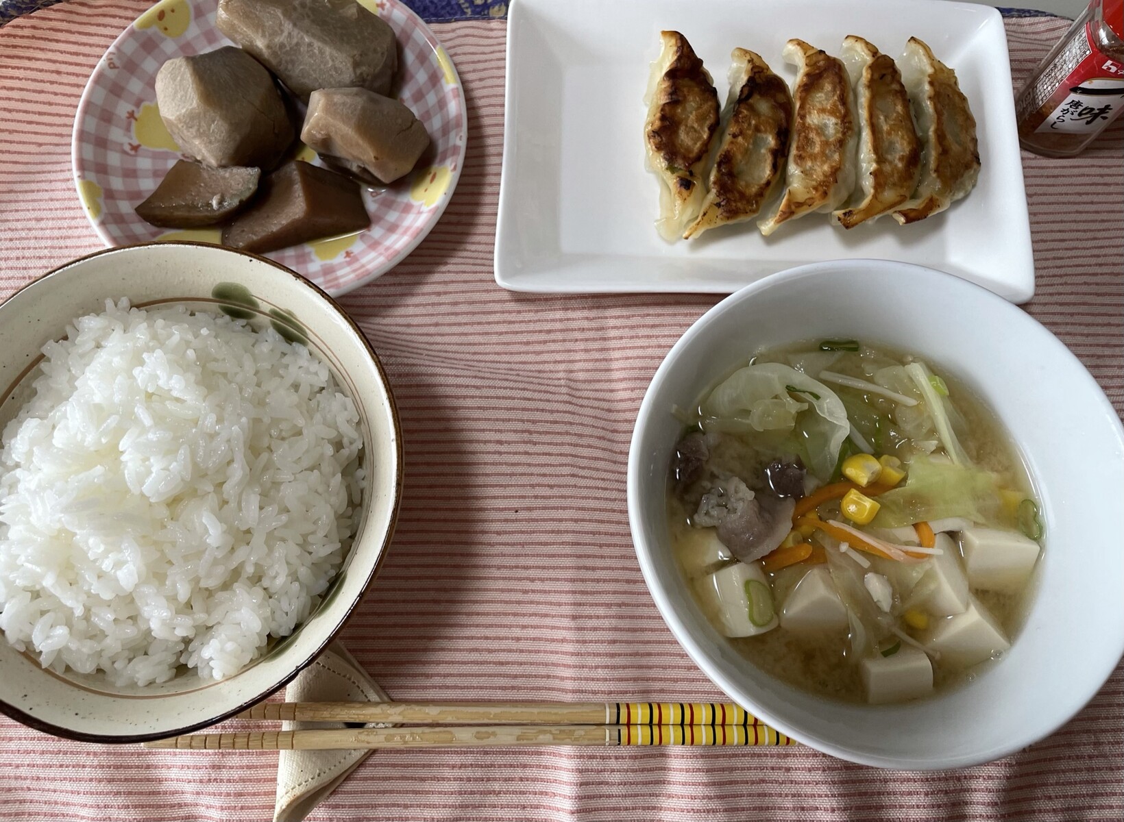 常備菜で作っていた里芋の煮っころがしと551の残っていた餃子に冷蔵庫に残っている野菜などで作った豚汁です🐖