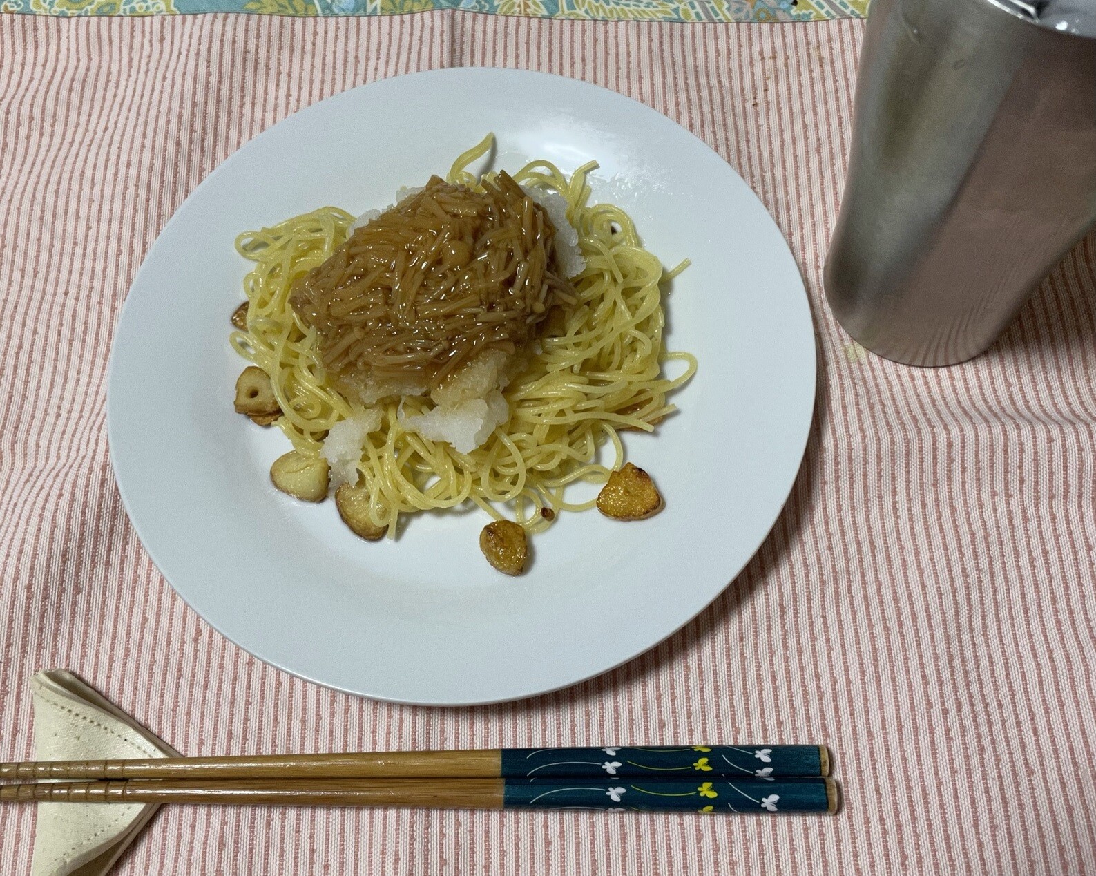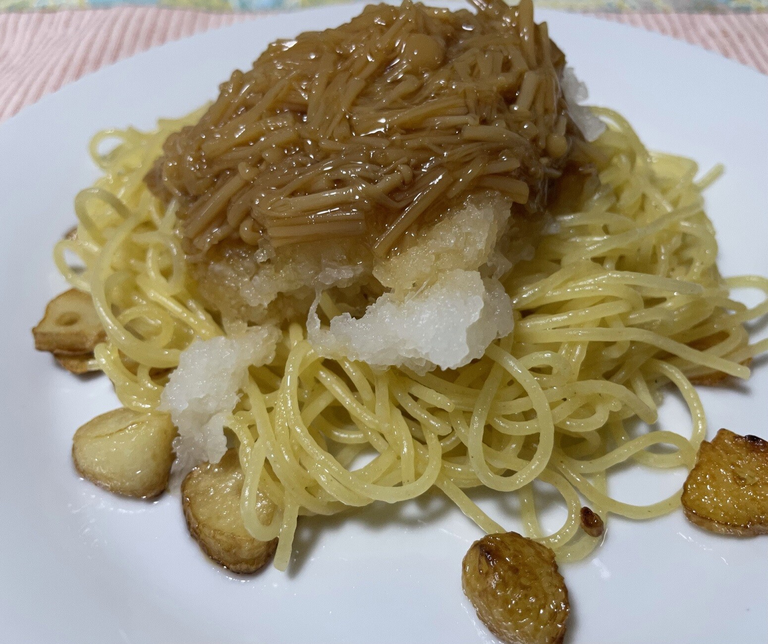 ニンニクと一緒に炒めたスパゲッティーの上に大根おろしをたっぷり乗っけてなめ茸をかけて少し醤油を垂らしたら出来上がりです