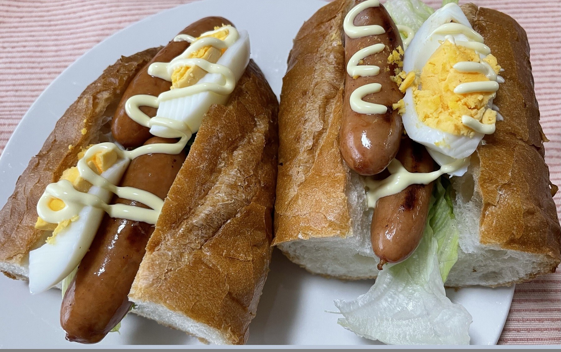 フランスパンとシャウエッセンの相性は抜群です、玉子とマヨネーズもいい仕事をしてくれています、そしてレタスがいいハーモニーを奏でてくれて美味しく頂けました。