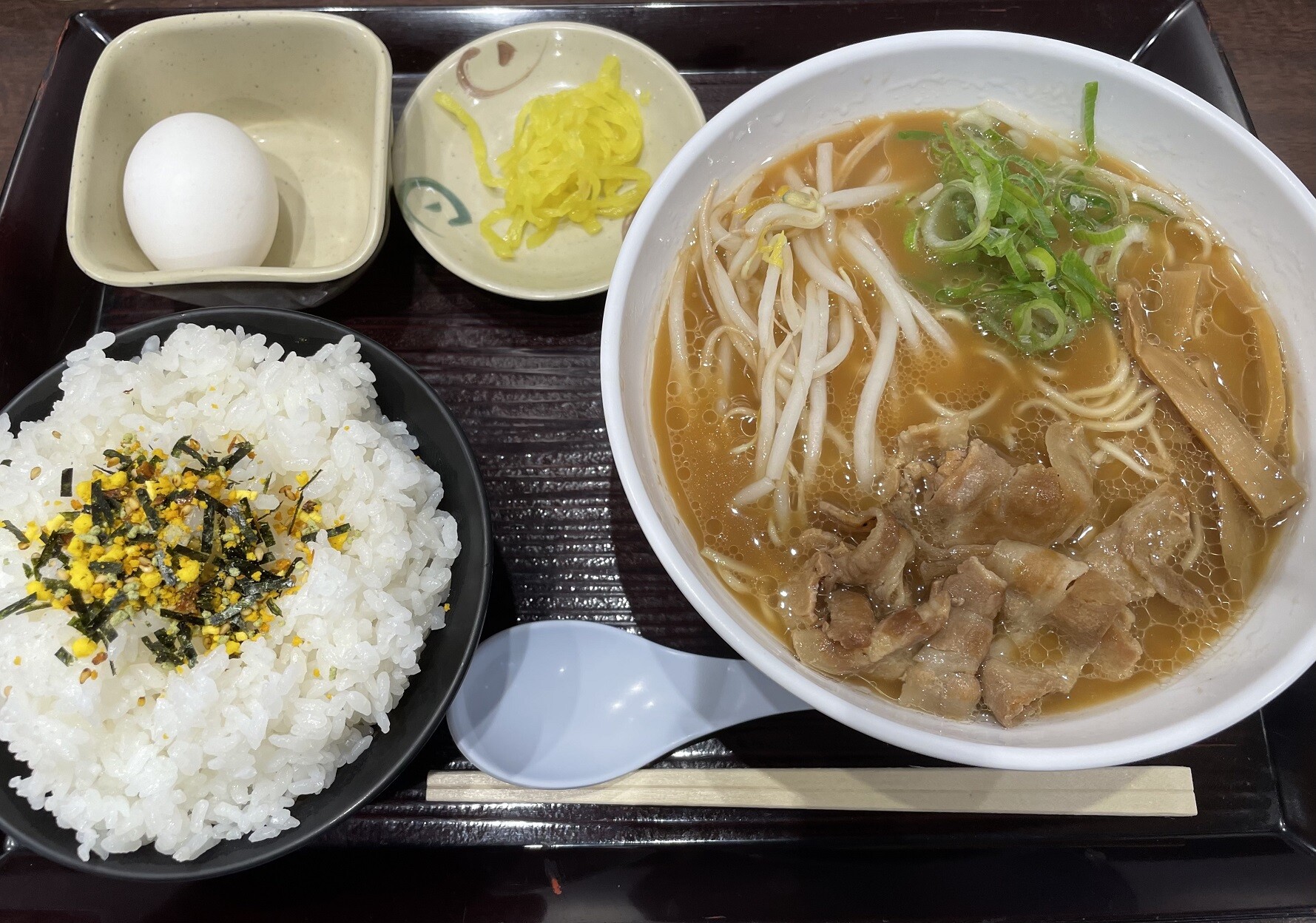 少し待ったら出来上がりましたヾ(≧∇≦*)/今回もいい感じですね、やはり徳島ラーメンと言えば生玉子