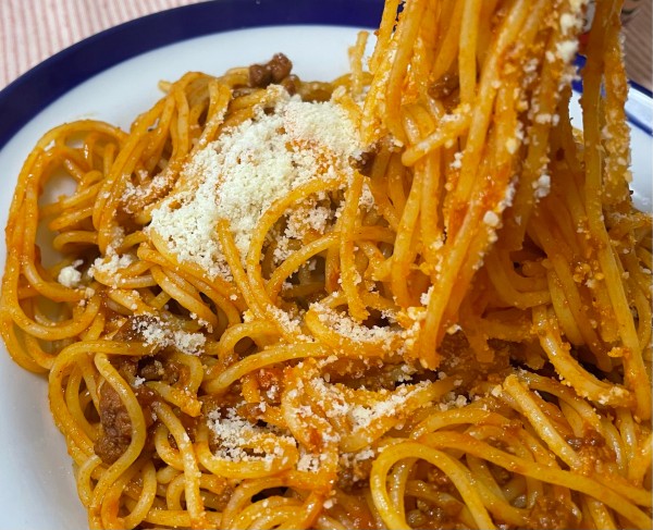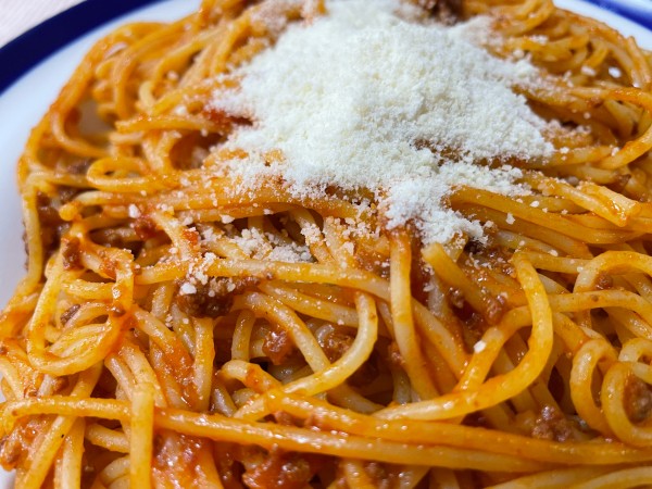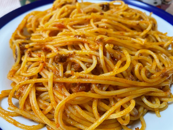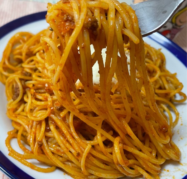 市販のミートソースをフライパンで和えて出来上がりのソースを使用しましたよ、それでは頂きましょう