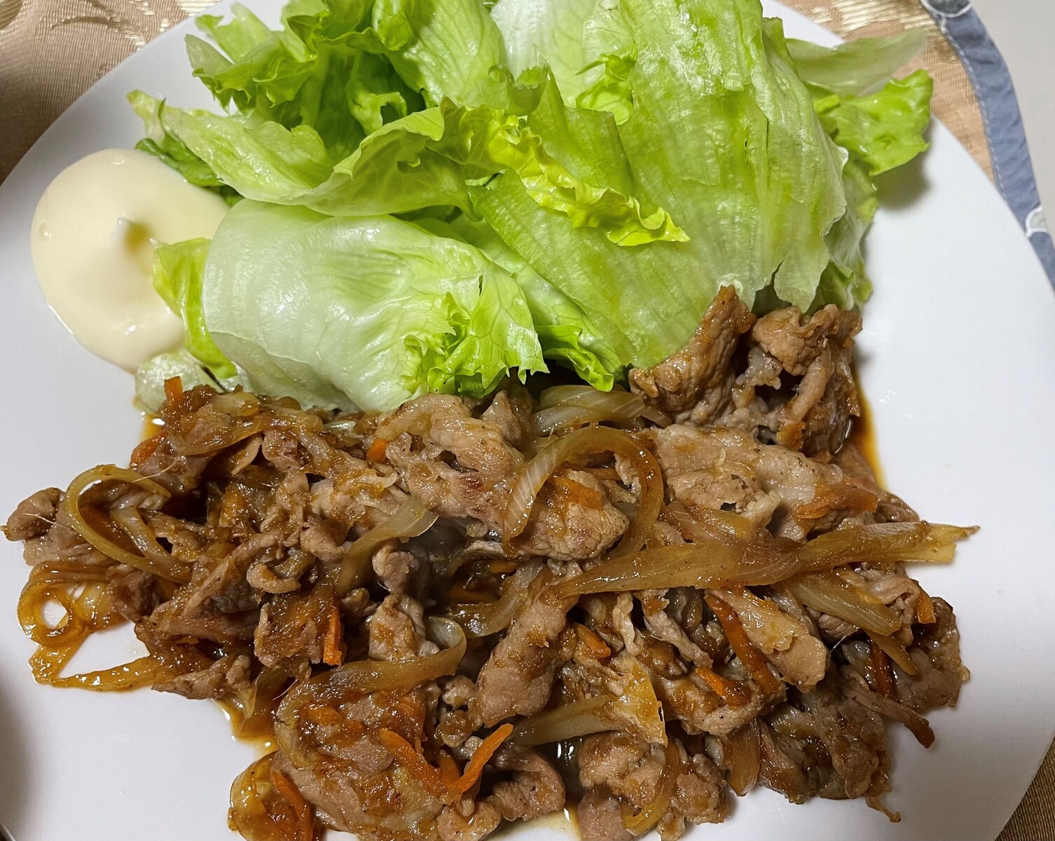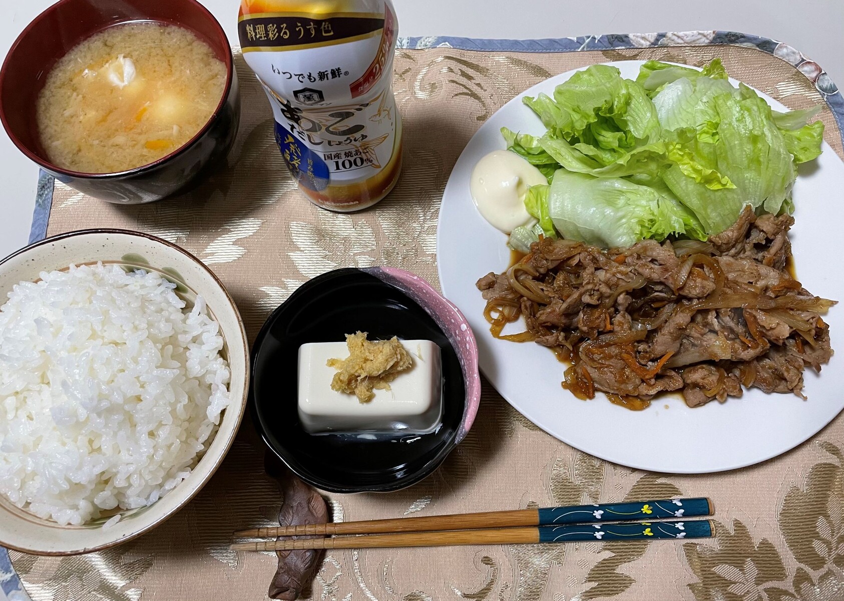 豚肉を使った和食にしましょう+。゚(`-ω-*)bキラッ豚バラ肉の生姜焼きにサラダと冷奴に玉子の味噌汁です。