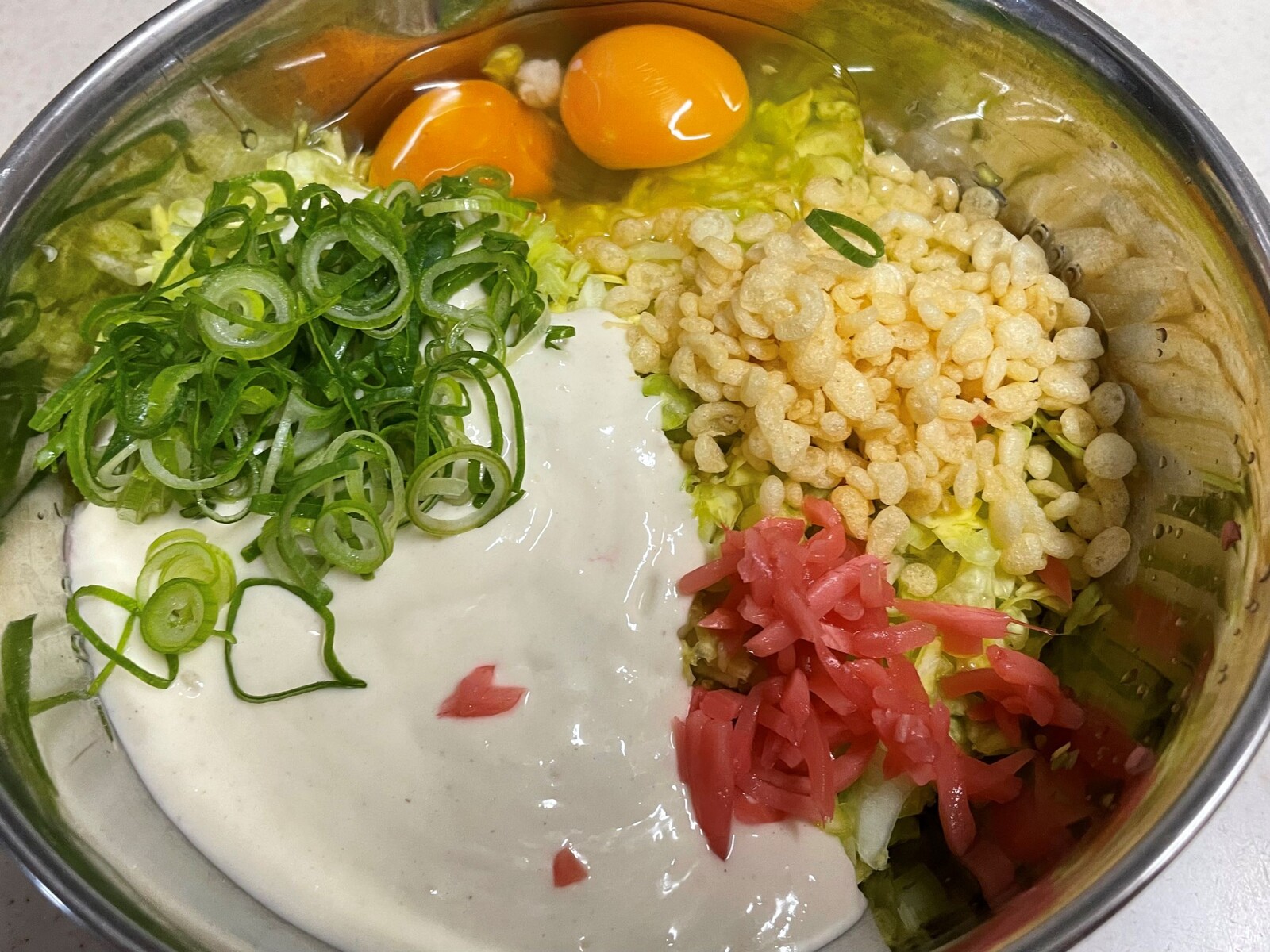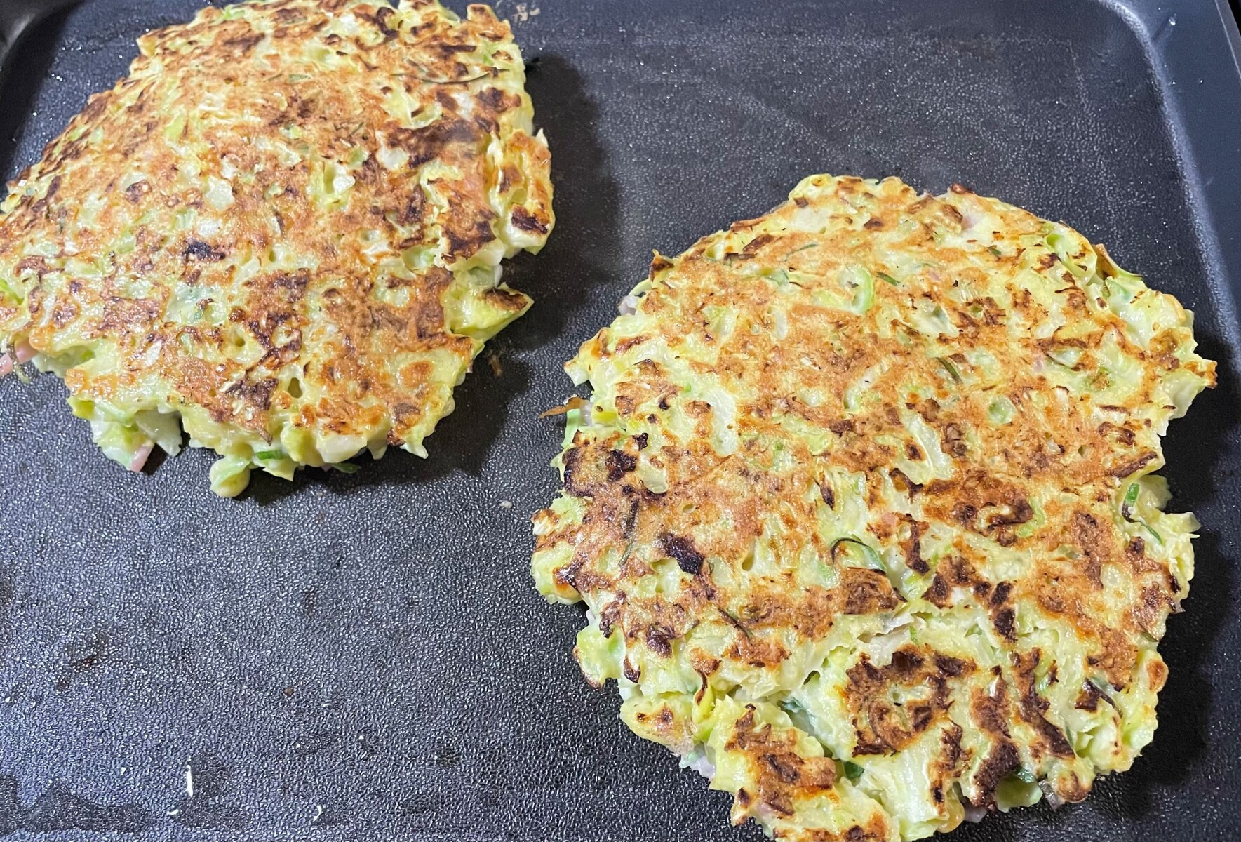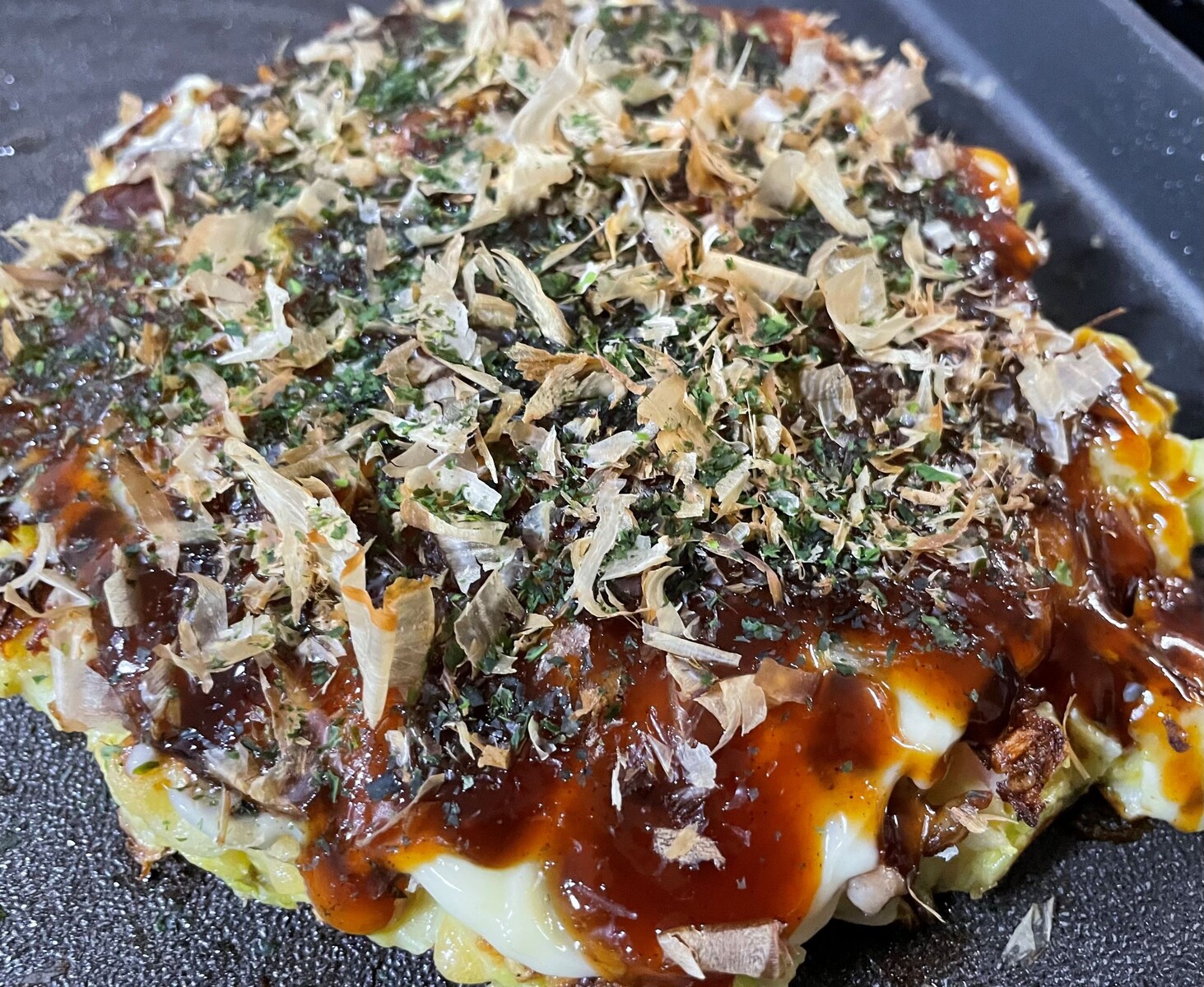 いつもと違い山芋の粉を入れたのでかなりふっくらしています、豚肉をしっかりと焼いてキャベツの甘味も出ていますよ、そしてシソが爽やかな風味を出していつも以上に美味しいお好み焼きになりましたヽ(≧▽≦)ノ"ワーイ