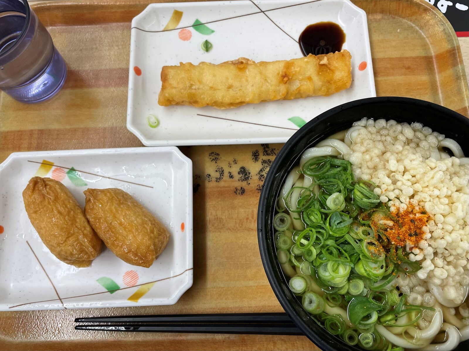 今回はかけうどんの中(2玉)とイカの天ぷらに稲荷寿司ですよ。