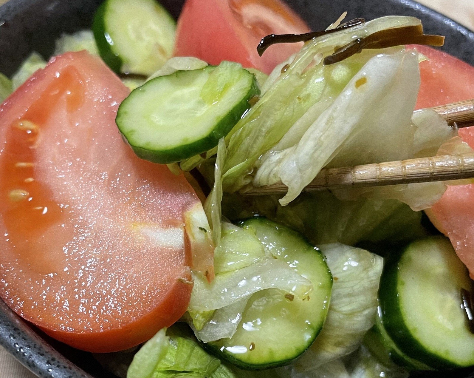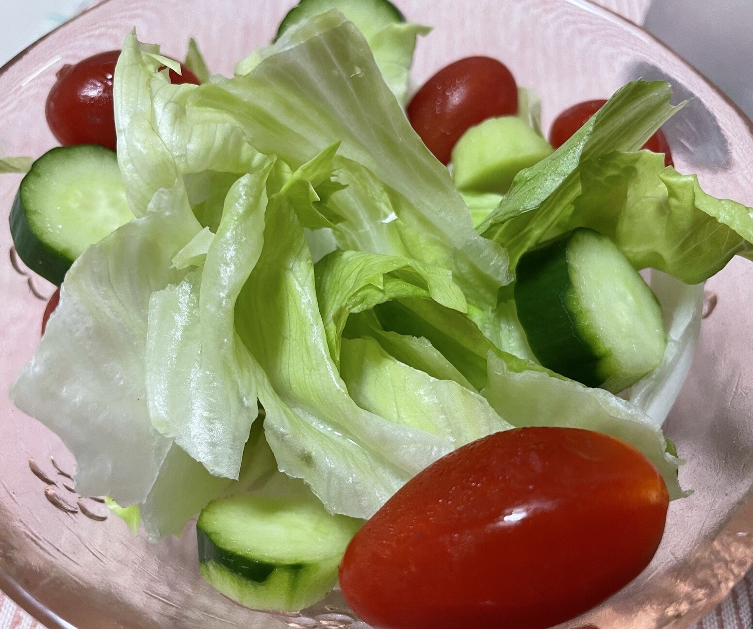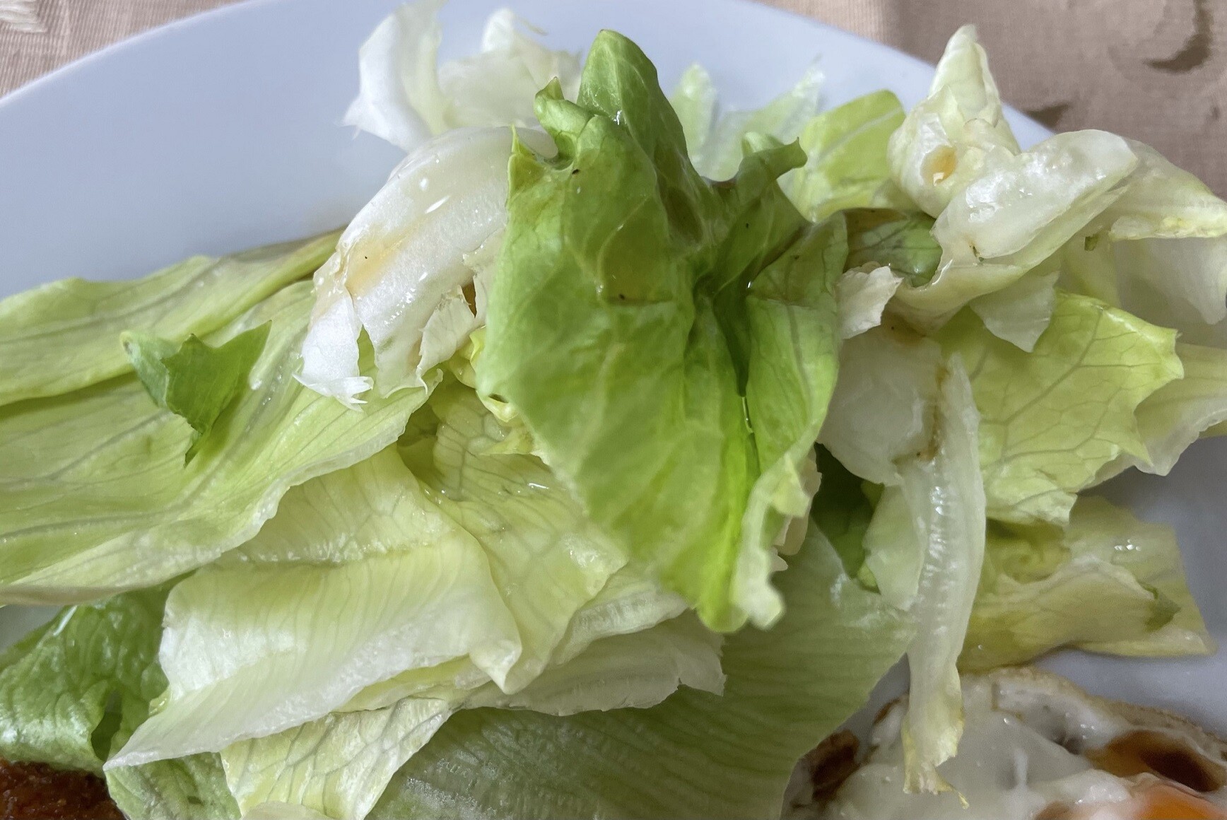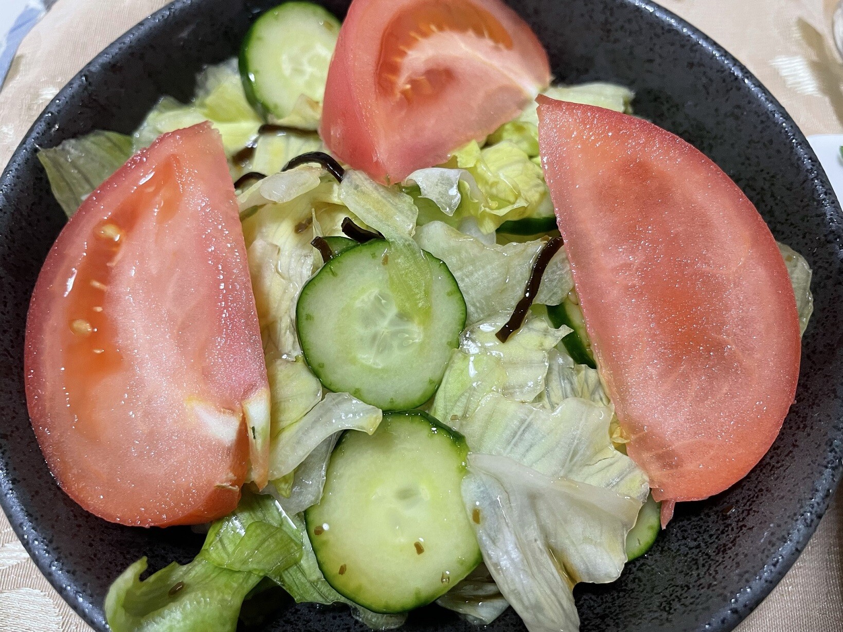 塩昆布とレタスのサラダに鶏肉の揚げ焼きです、唐揚げじゃありません