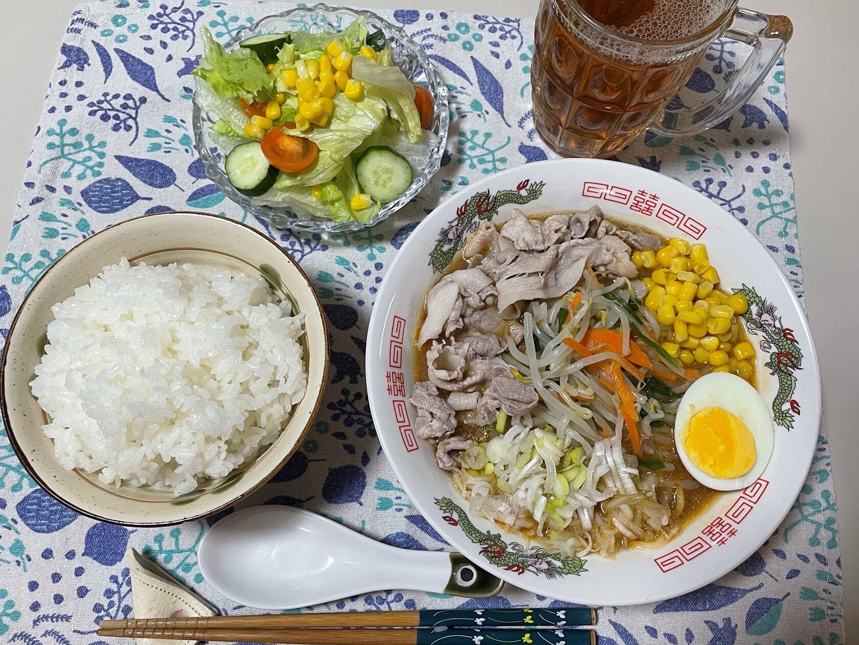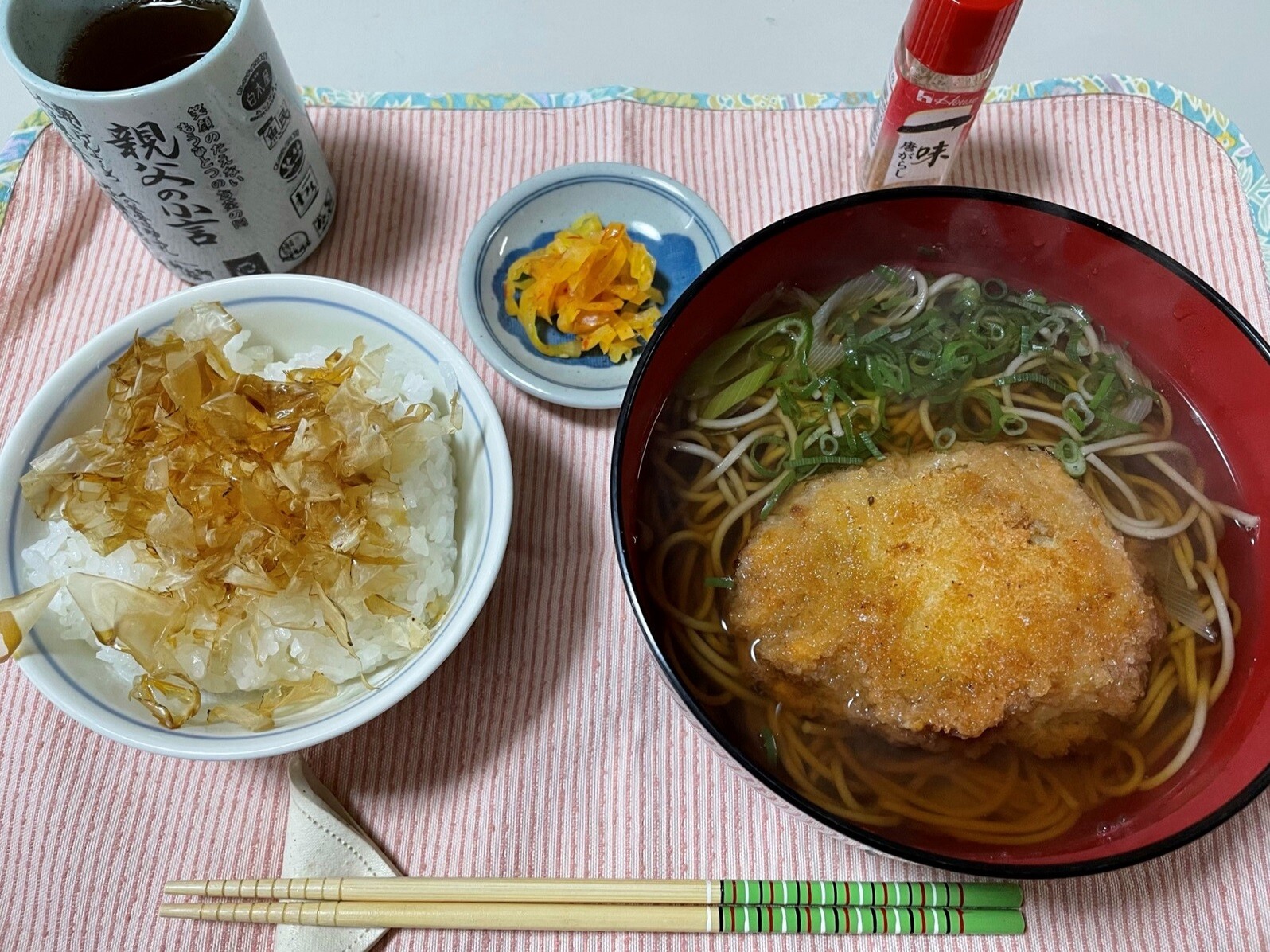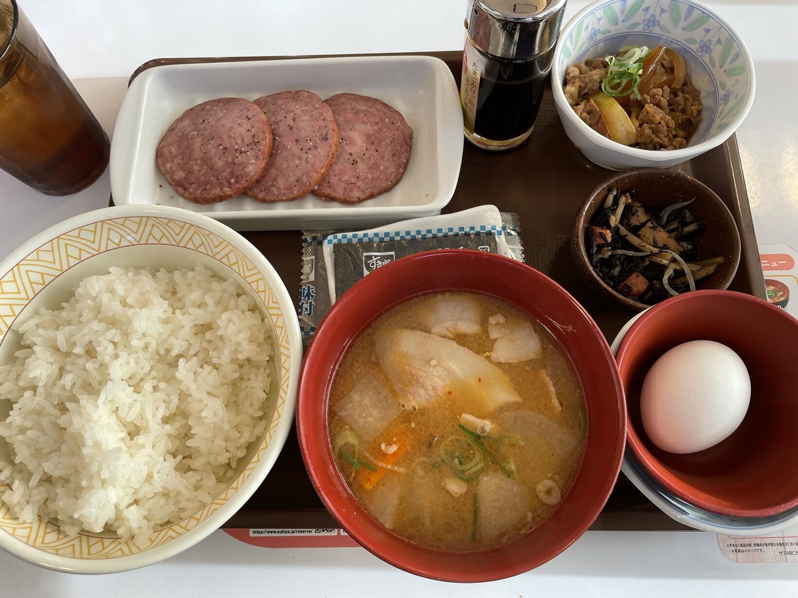 ちなみにハムみたいに見えてるのがソーセージですよ、どういう風にして食べるかな、生玉子をお新香にチェンジした方が良かったかな・・・