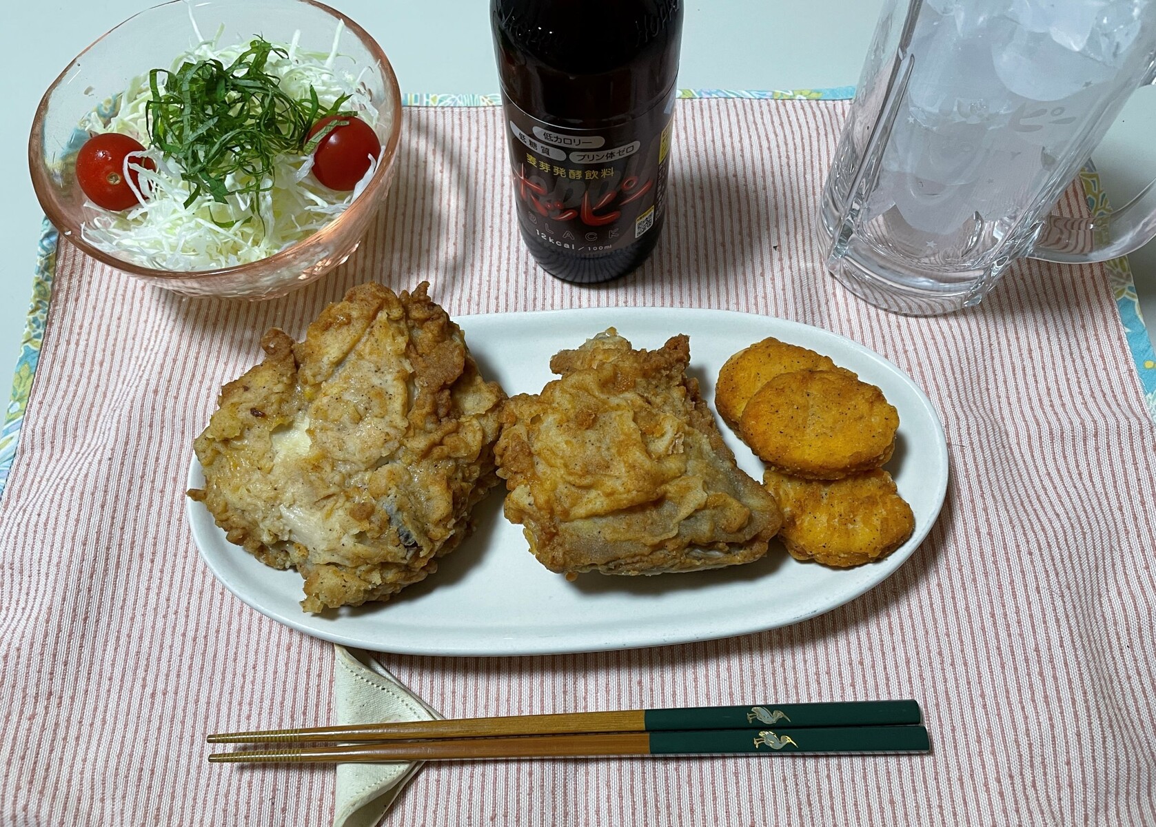 黒ホッピーとケンタのチキンとナゲットにシソサラダを用意しました🥗