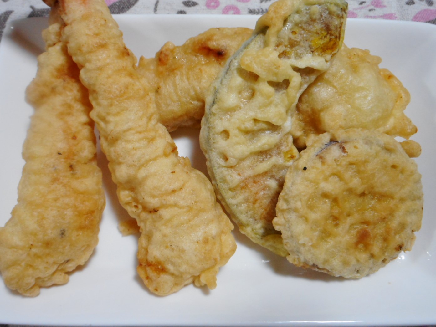 少し前に大量に天ぷらを揚げた時に冷凍ストックしてた物を自然解凍してトースターで温めました。