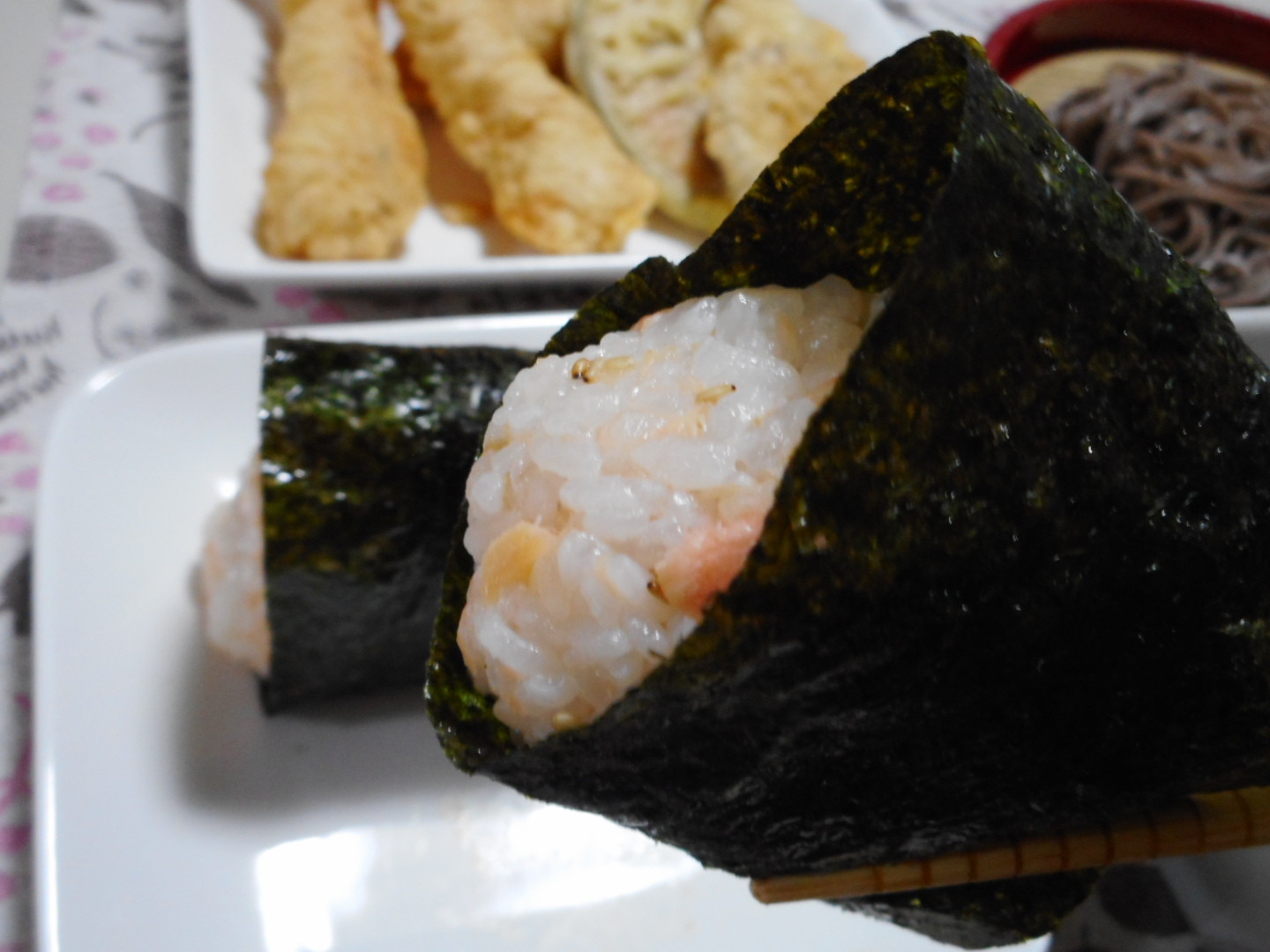 そんな美味しいツユに天ぷらをつけて食べたら愛情おむすびも進むってもんですよ🍙