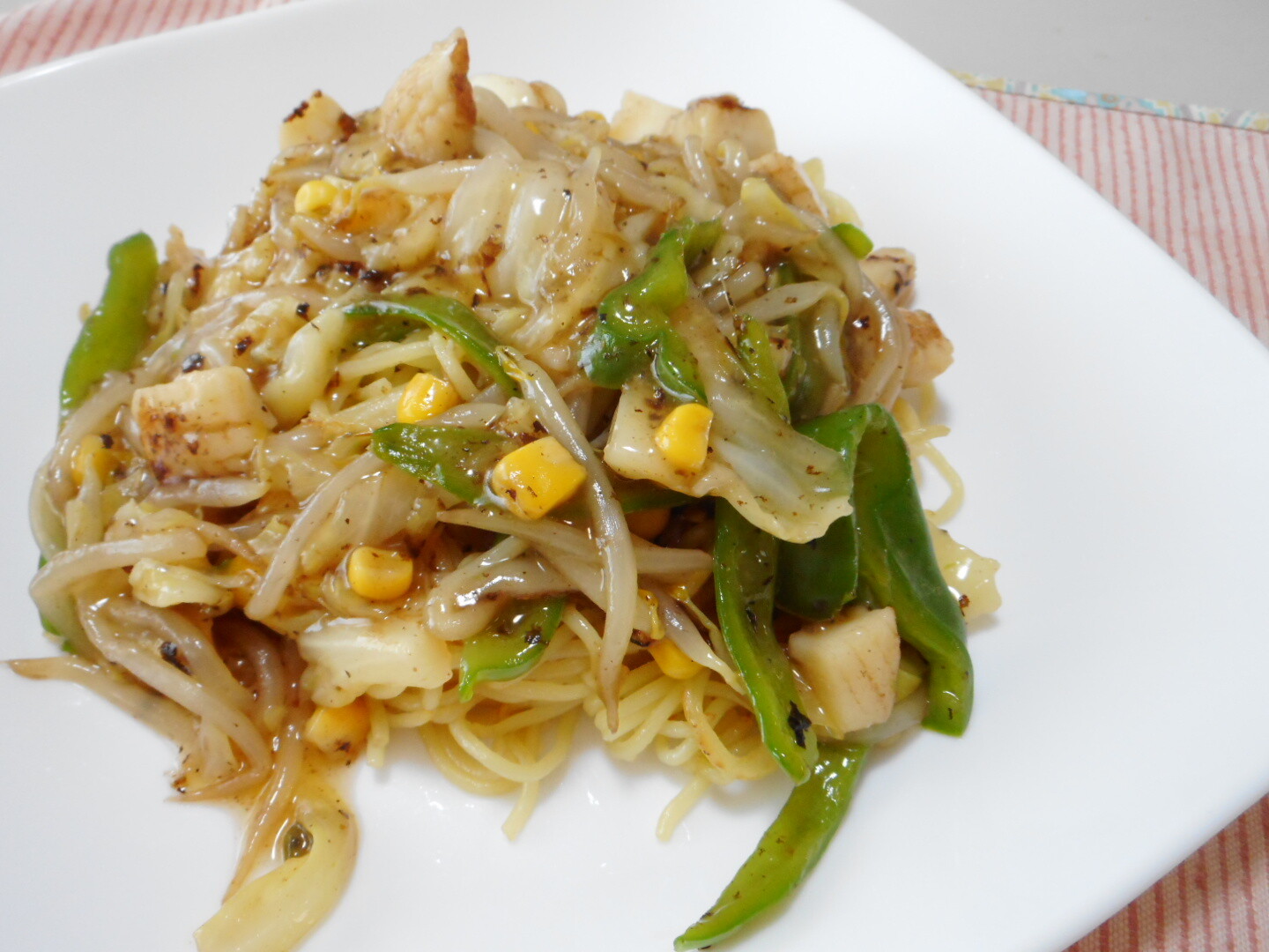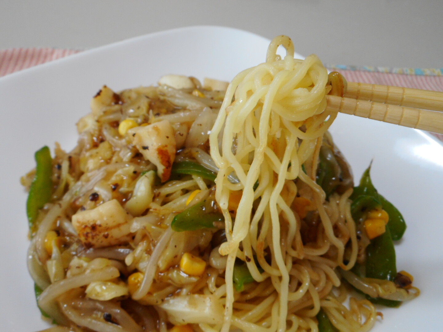 麺と具は別々に作ってます、麺は醤油と少しのにんにくで香ばしく焼きました