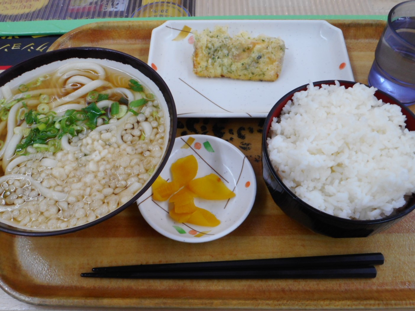 かけうどんにごはんとおかずが一品とこれがいいんですよ、でも鶏天は食べないのです、こちらの鶏天はあまり鶏好きのふ~ちゃんのお口に合わないのです珍しい事に・・・