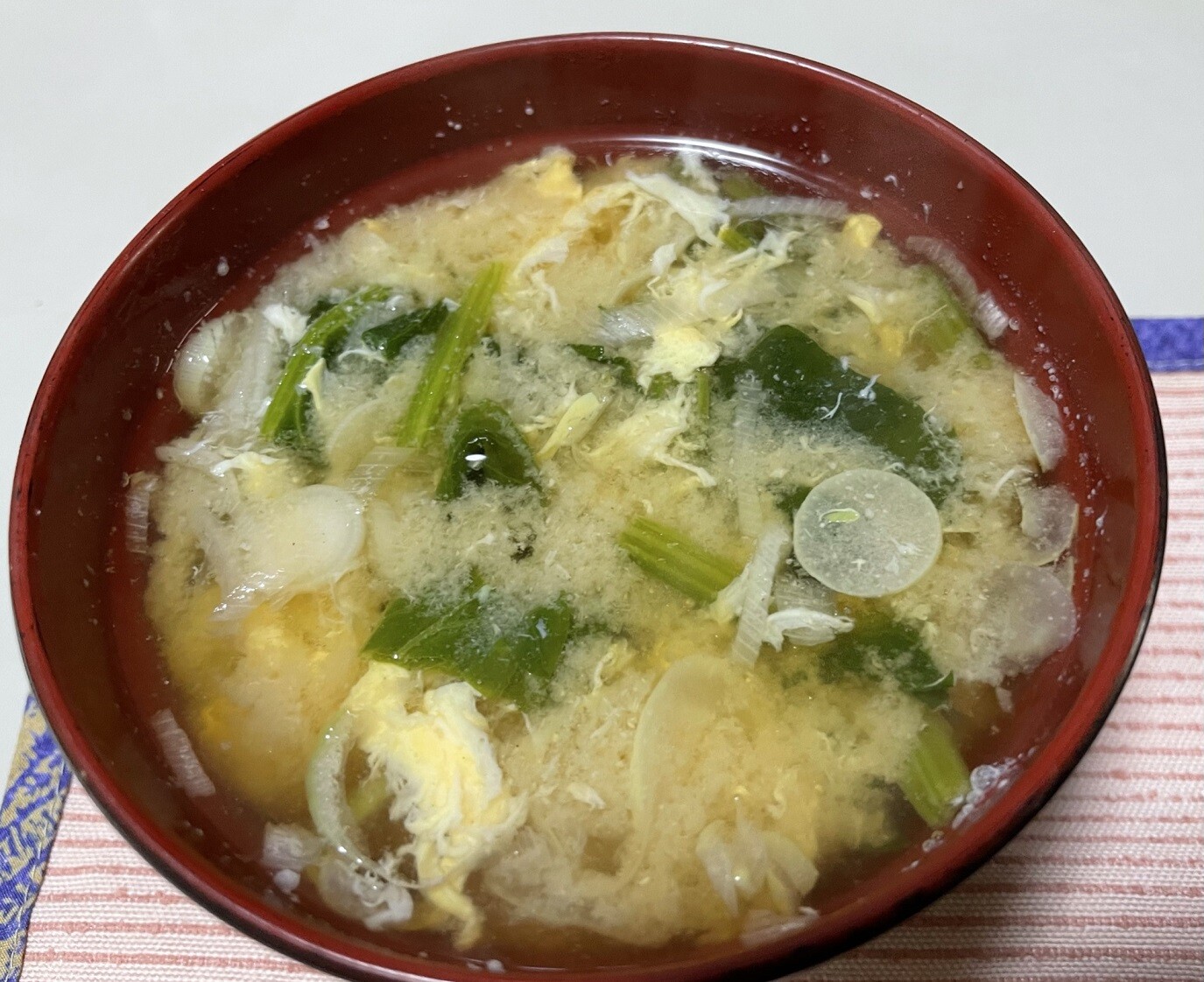 ごはんから時計回りにほうれん草と玉子の味噌汁