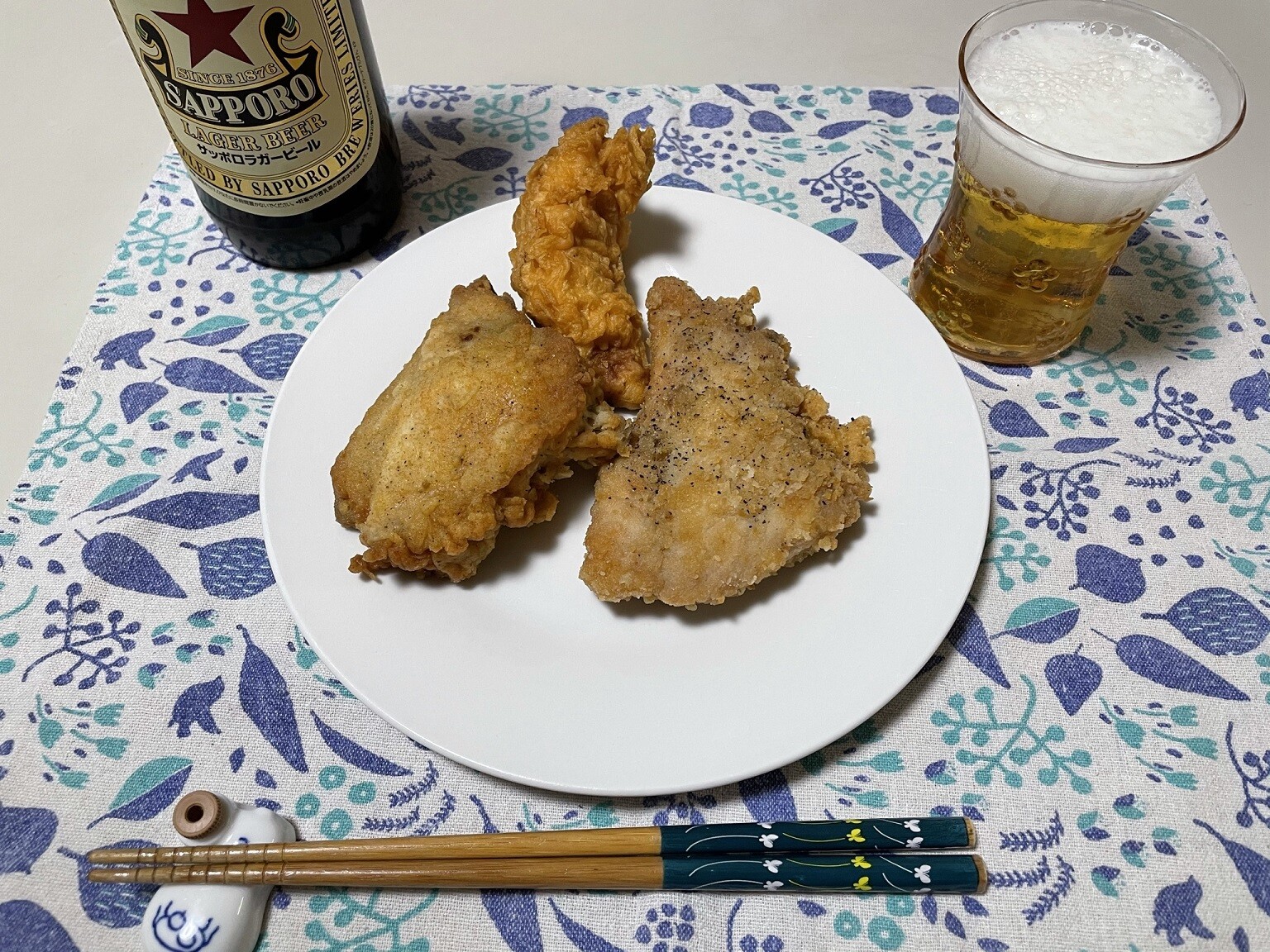 右から時計回りにうま塩チキンにオリジナルチキンにクリスピーチキンです、この三つだけでもかなりアルコールが進みそうです、もちろん瓶ビールの次は焼酎ですよ、この日にたっぷりと酒のカクヤスから酒類を配達してもらっているんでwkwk