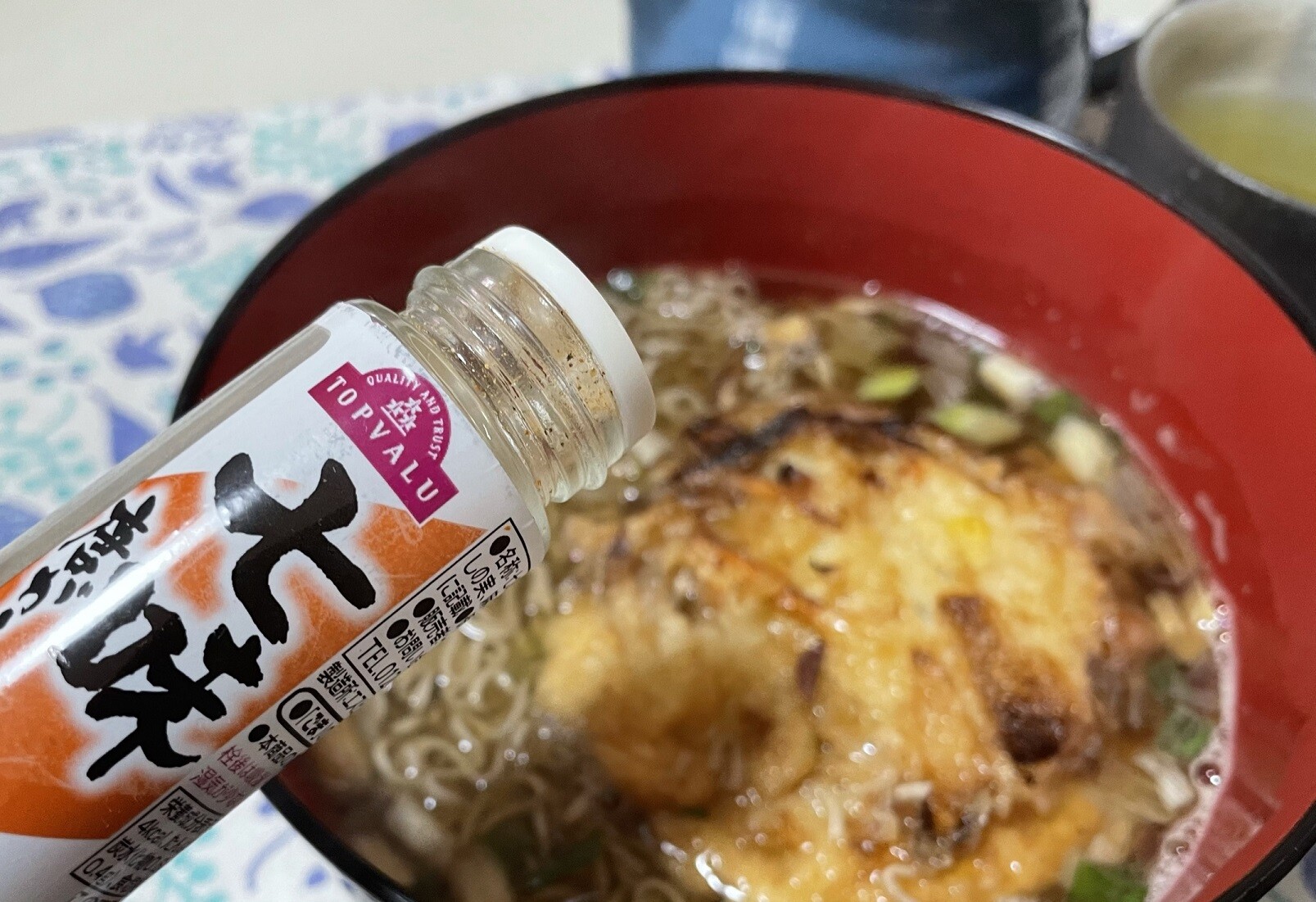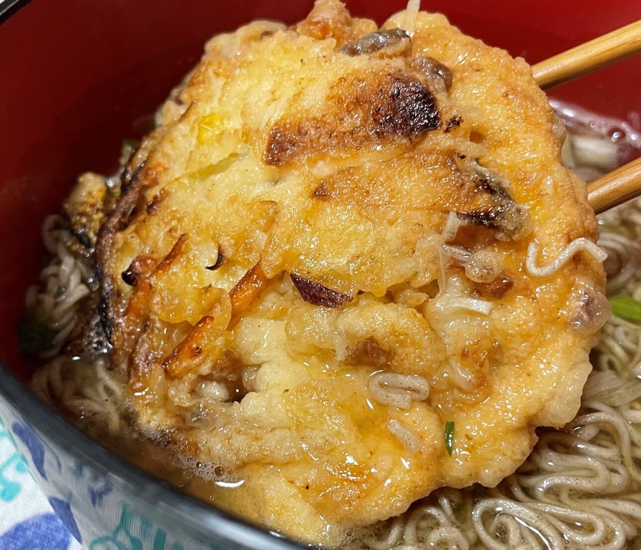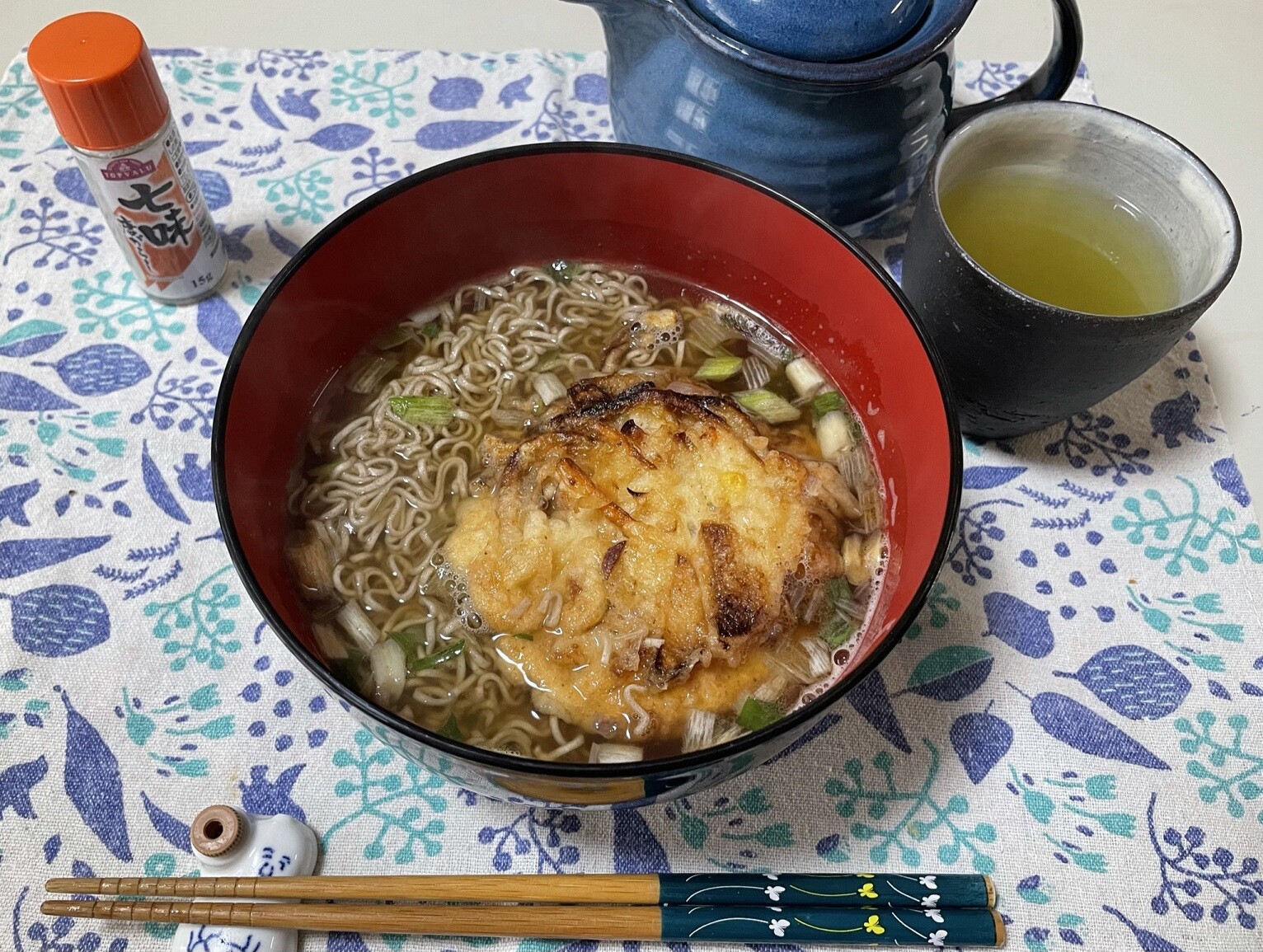 インスタントの蕎麦がラスイチだったのでストックしていたかき揚げを乗っけて頂きましょう。