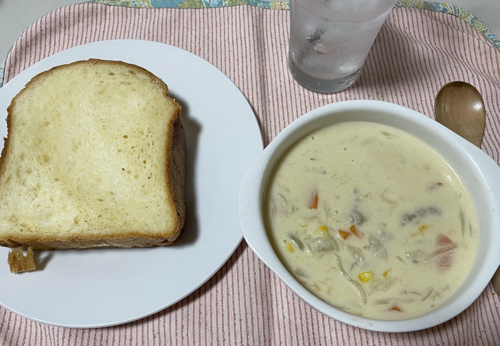 この日作った食パンはソフトハニーパンです、外はカリッと中はふんわりで味はほんのりのハチミツの甘さがありますよ、シチューと一緒に食べても差し障りはありません、一緒に食べましょうwkwkいやっマジで今回のシチューは美味しいわ!!