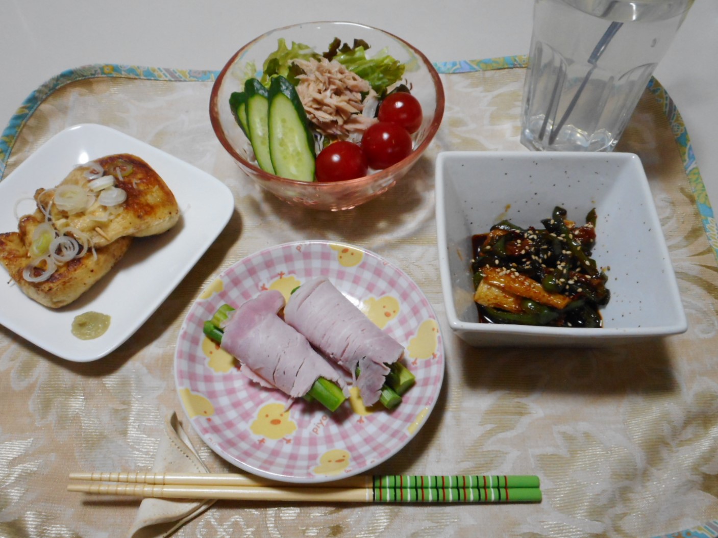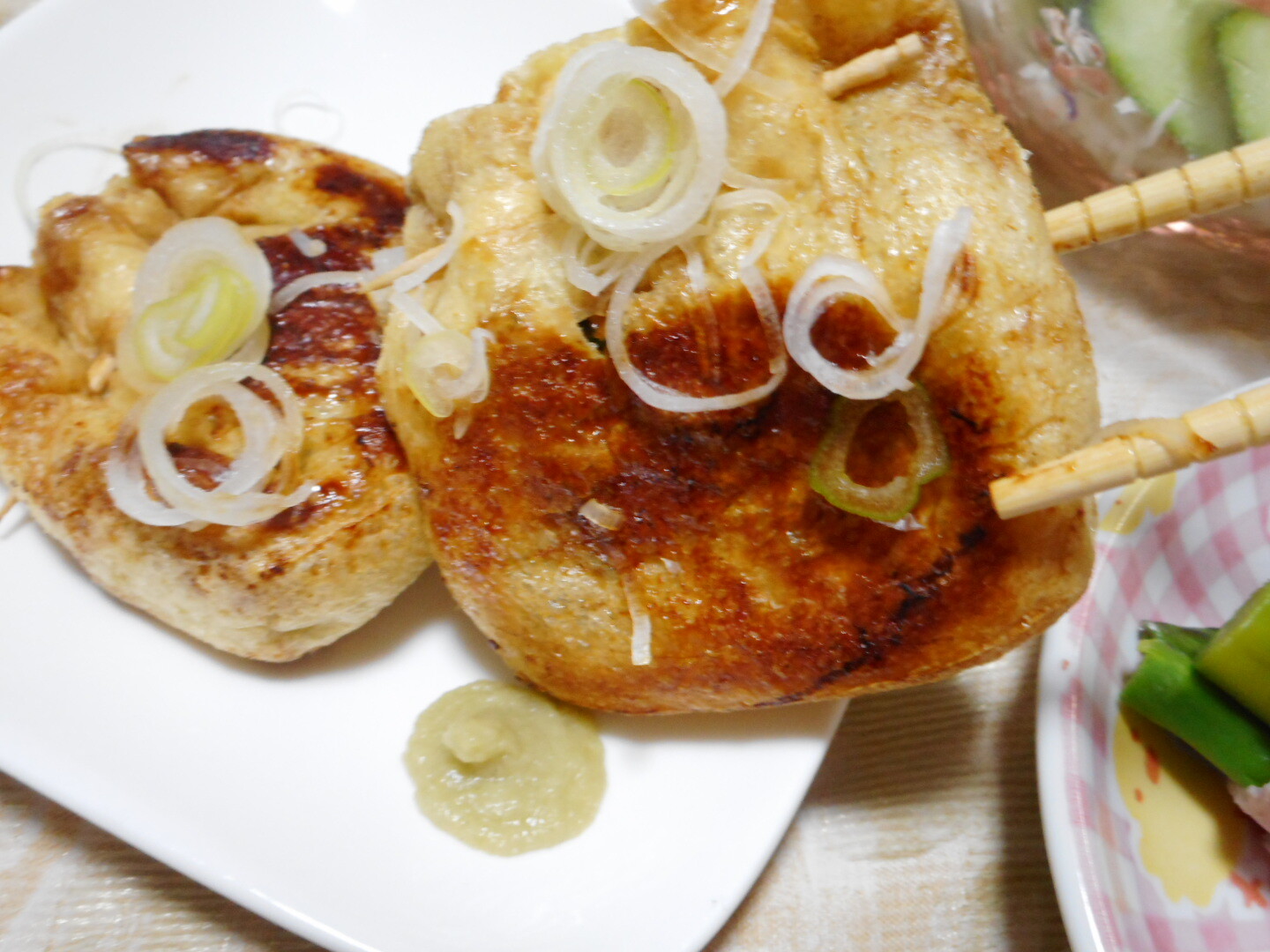 納豆はタレと混ぜて油揚げの中に入れて軽く焼いて醤油で香り付けだけしました、そしてピーマンと竹輪のキンピラは味が濃かったですよ・・・