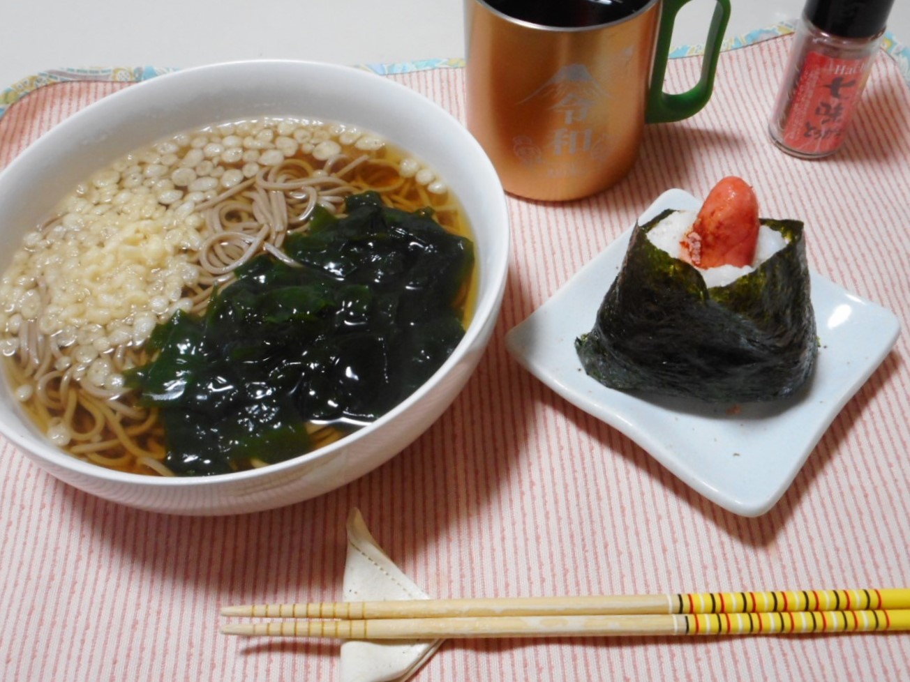 ワカメそばと238のネオ愛情おむすびですよ、ネオのおむすびは具材が見えて海苔の巻き方が違うんですよ、必要ないけど覚えておいて下さいね