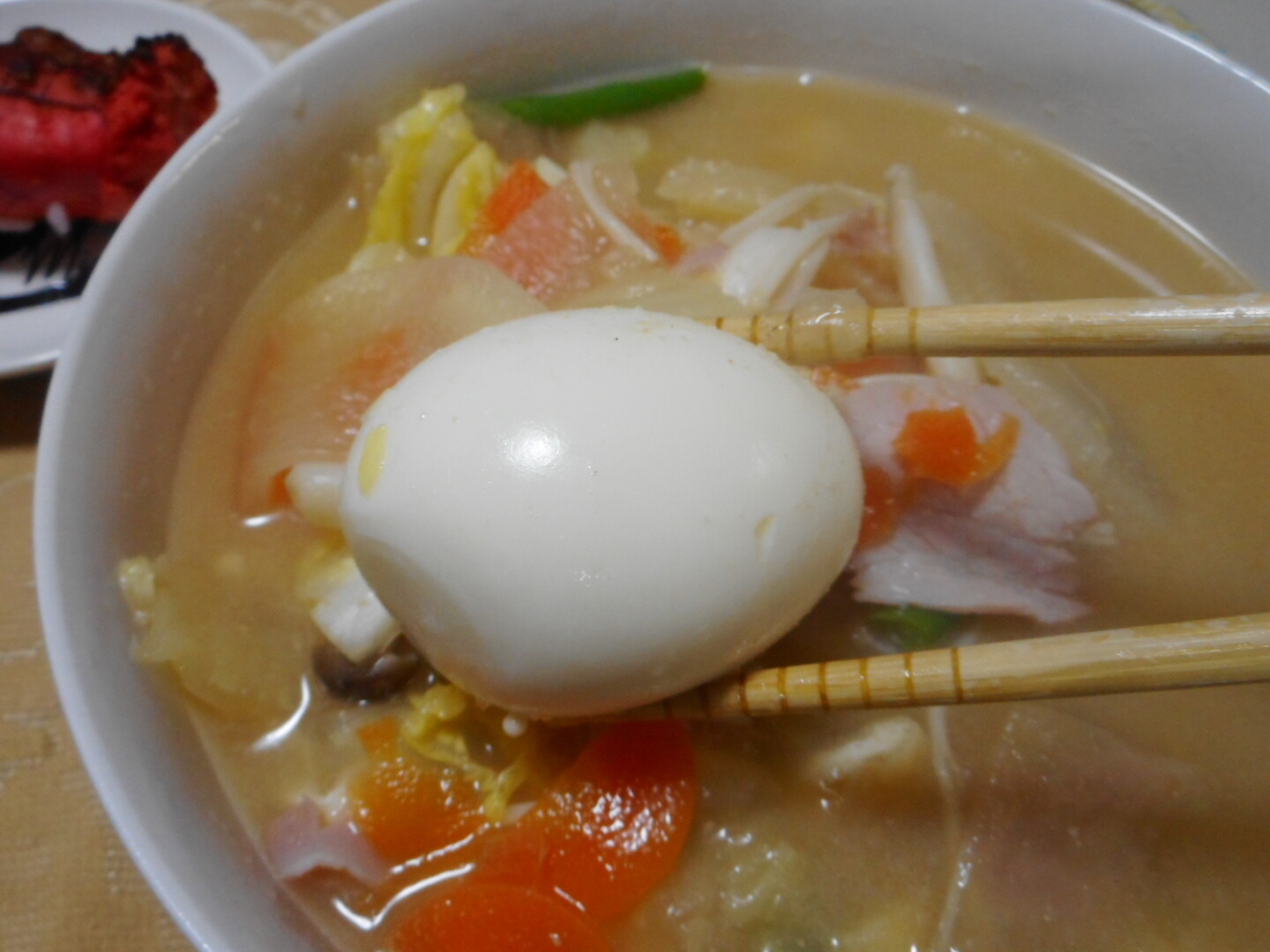 自家製叉焼入りの焼飯とその焼豚が入ったリンガーハットの野菜たっぷりちゃんぽんに味玉もトッピングしました