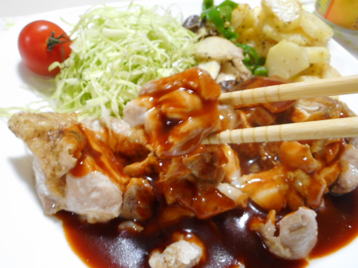 こんがり焼けたら業務用スーパーで買った安物のデミグラスソースをぶっかけて頂きましょう。