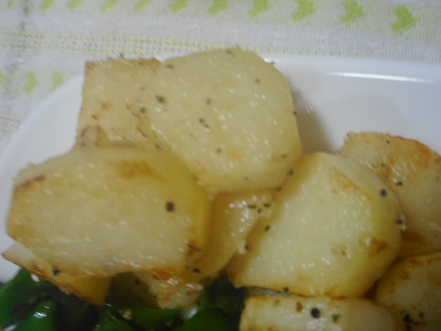 生のジャガイモをカットして一緒にトースターで焼いて作りました、仕上げはフライパンにバターを敷いて塩コショウで味付けして頂きました。