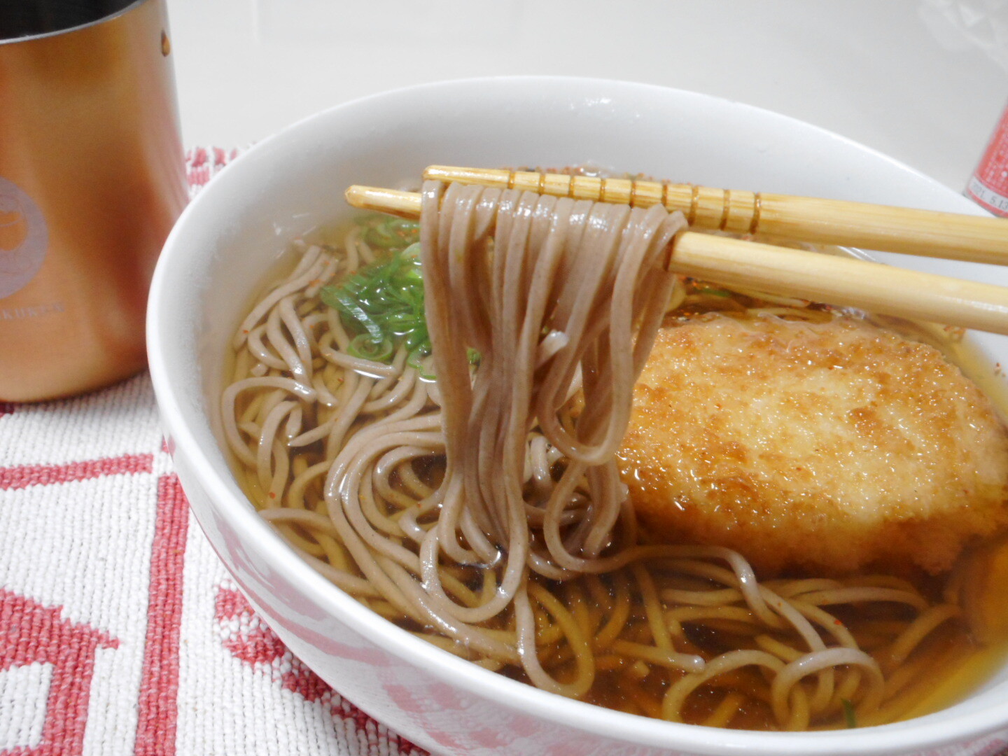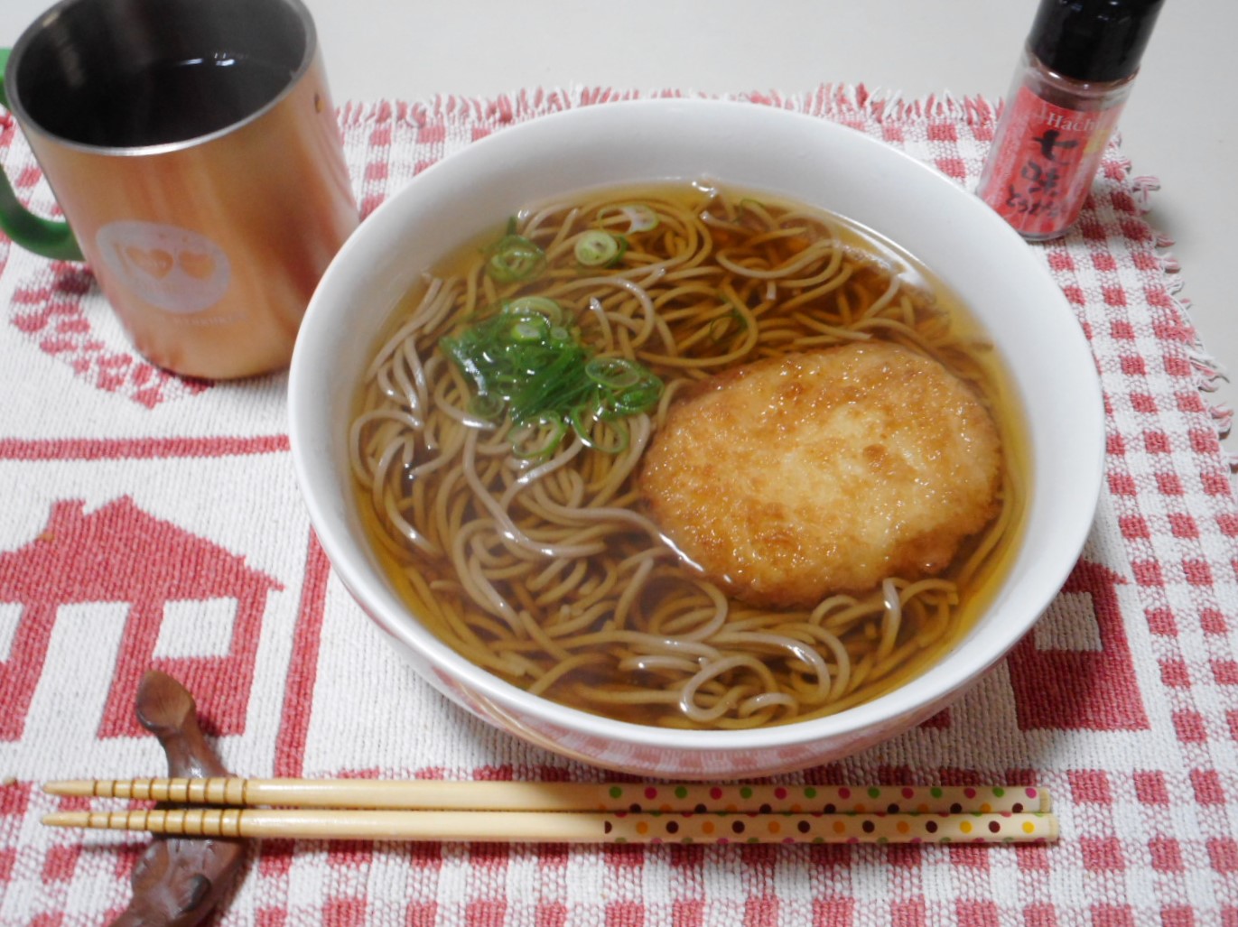 コロッケそばと昨日の冷凍ピラフの残りです。