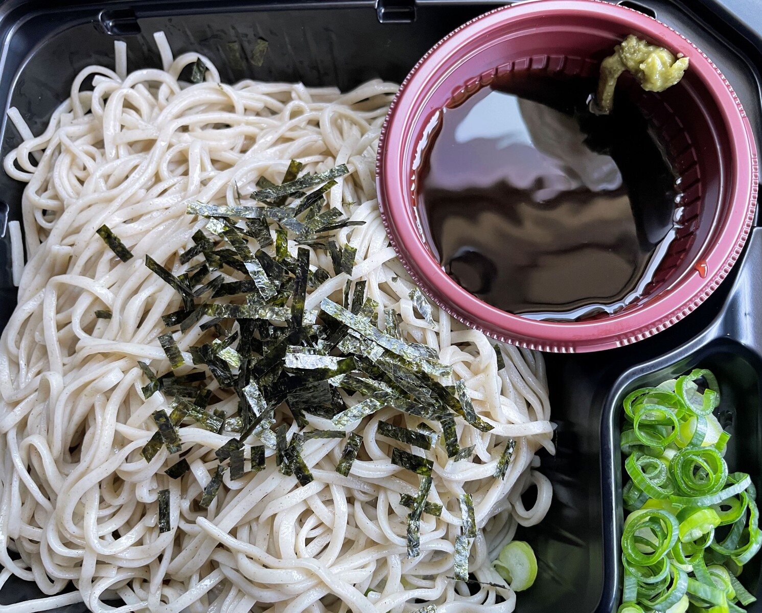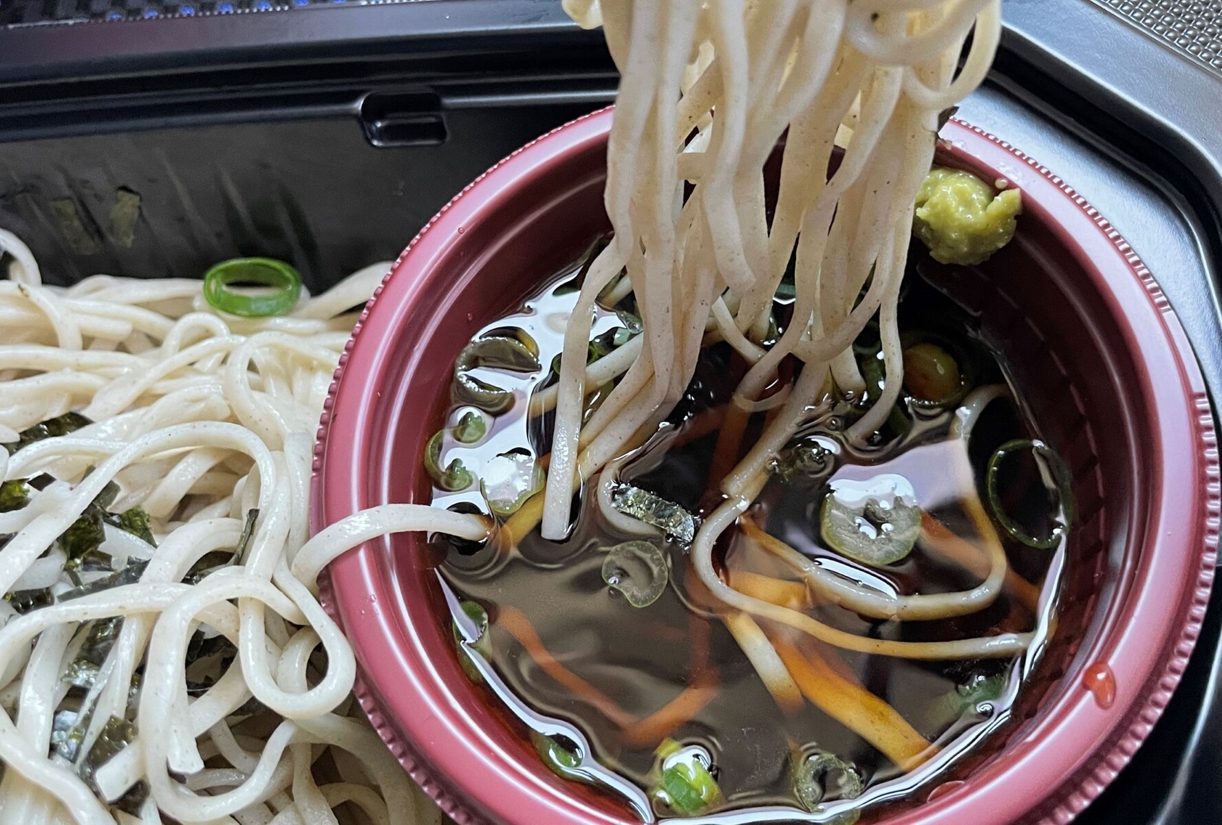 途中で寄ったコンビニでは弁当が全て売切れていたのでこのメニューになりました、エアコンの効かない車内で食べるには冷たいざるそばがいいかなって思いまして・・・