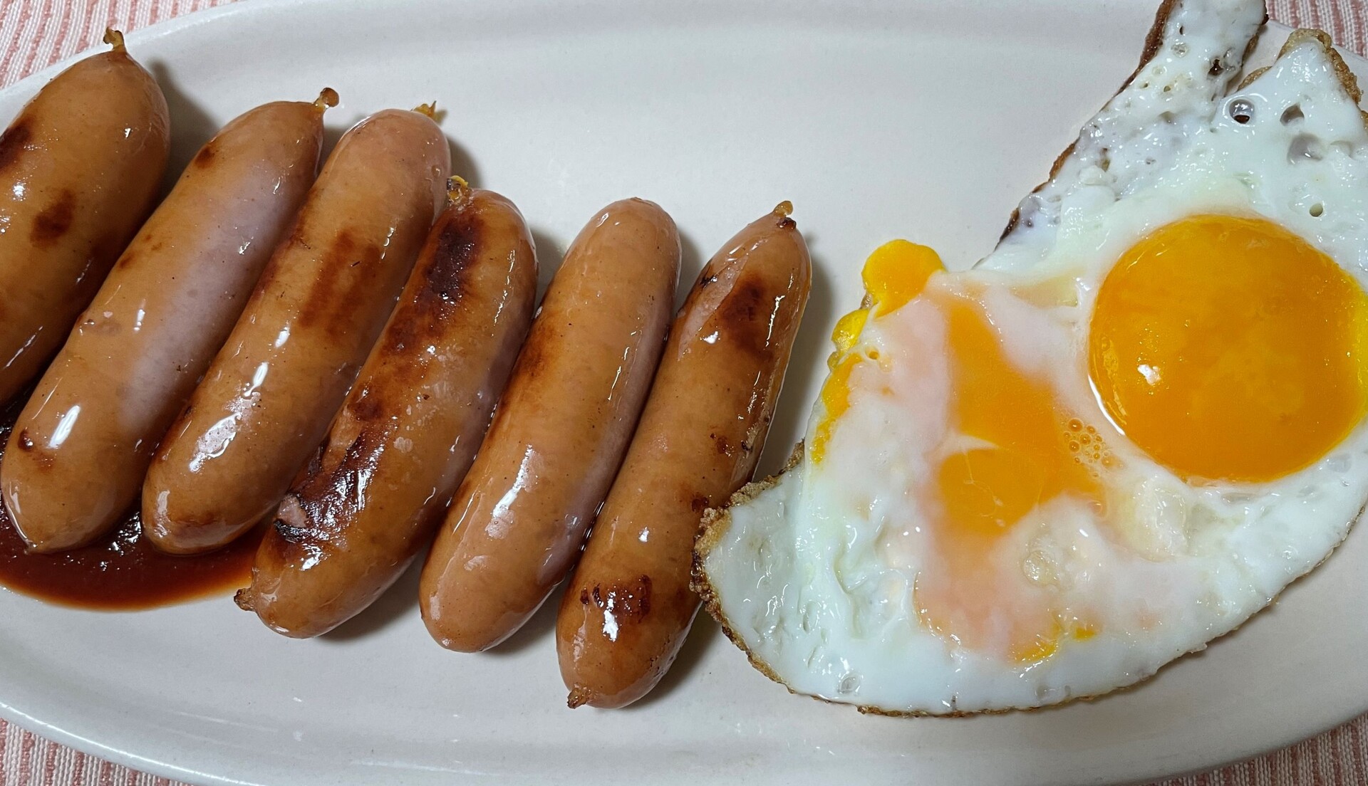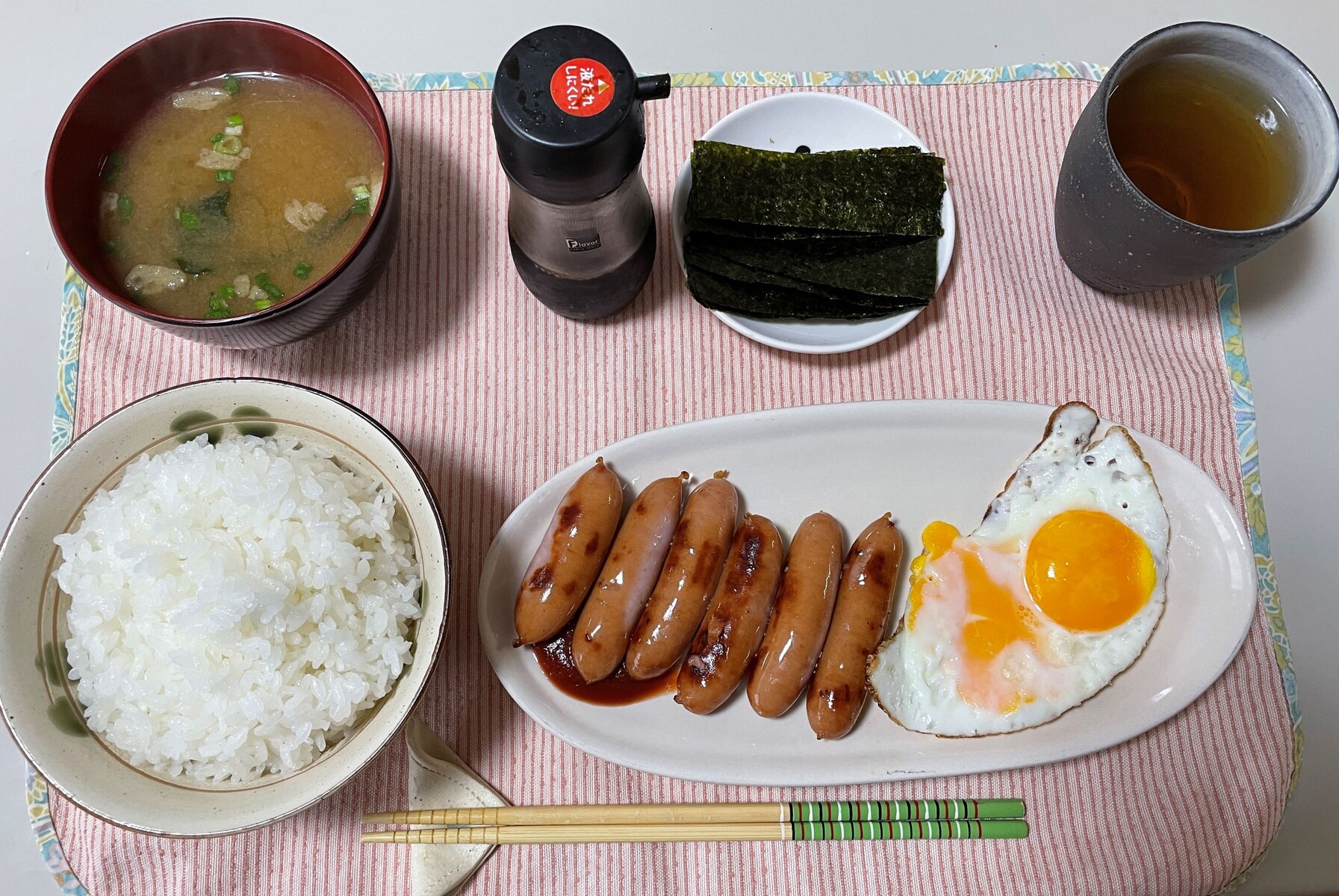 そうして炊き上がったごはんと共に目玉焼きとシャウエッセンに味付け海苔と即席の味噌汁ですよ、今回はリベンジ出来たかな??