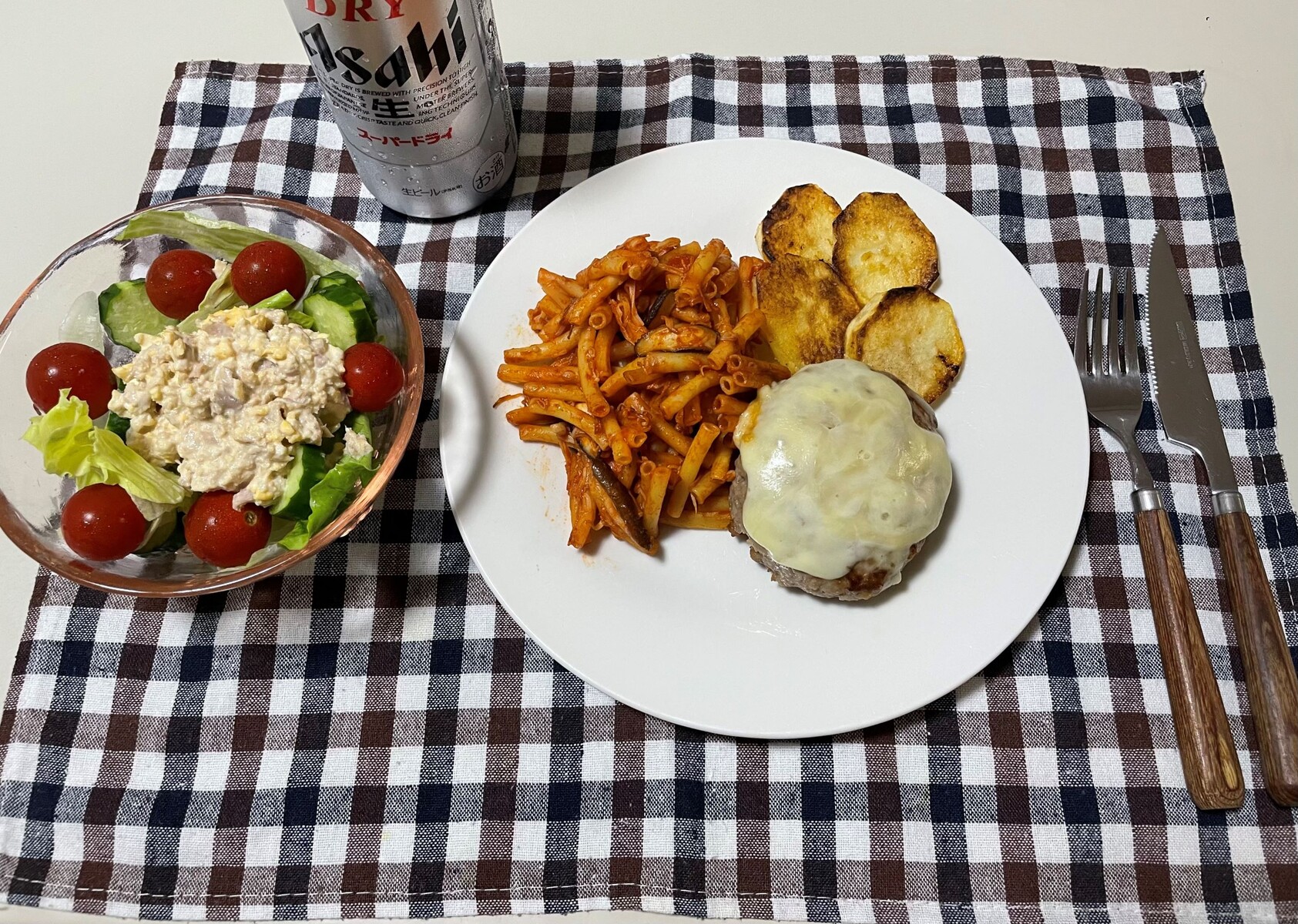 ツナ玉子サラダにパスタやポテトも添えてほんまもんのビールを頂きましょう