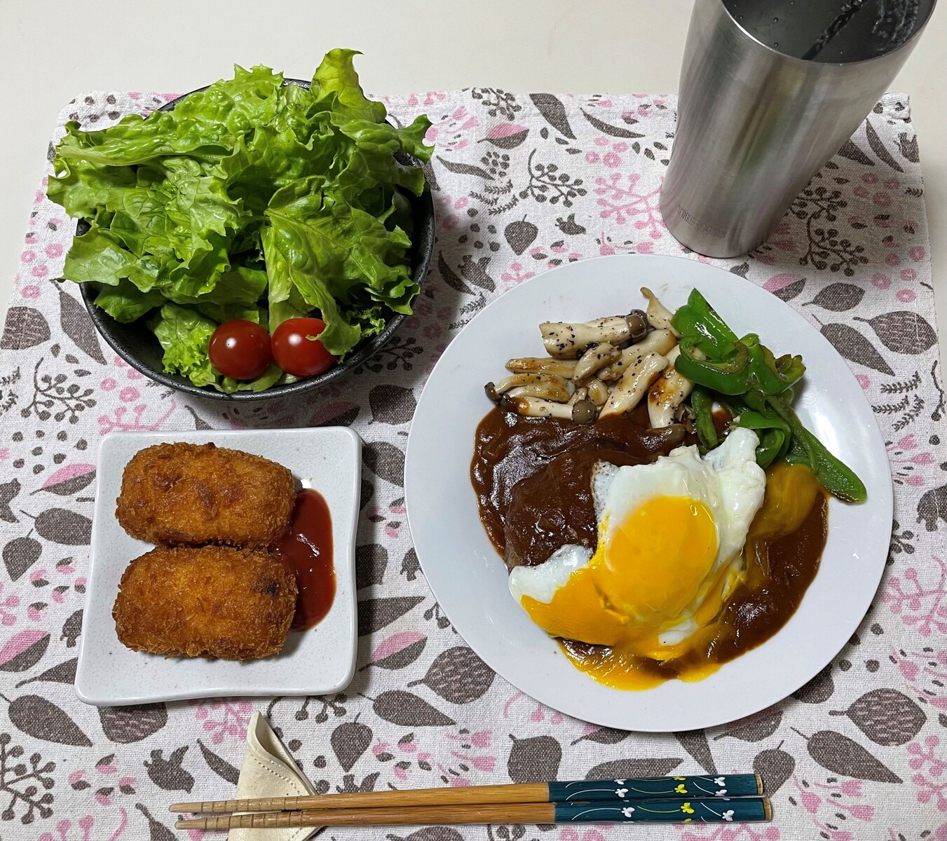 煮込みハンバーグ目玉焼き乗せにスーパーで買ったカニクリームコロッケと葉っぱサラダです🥗