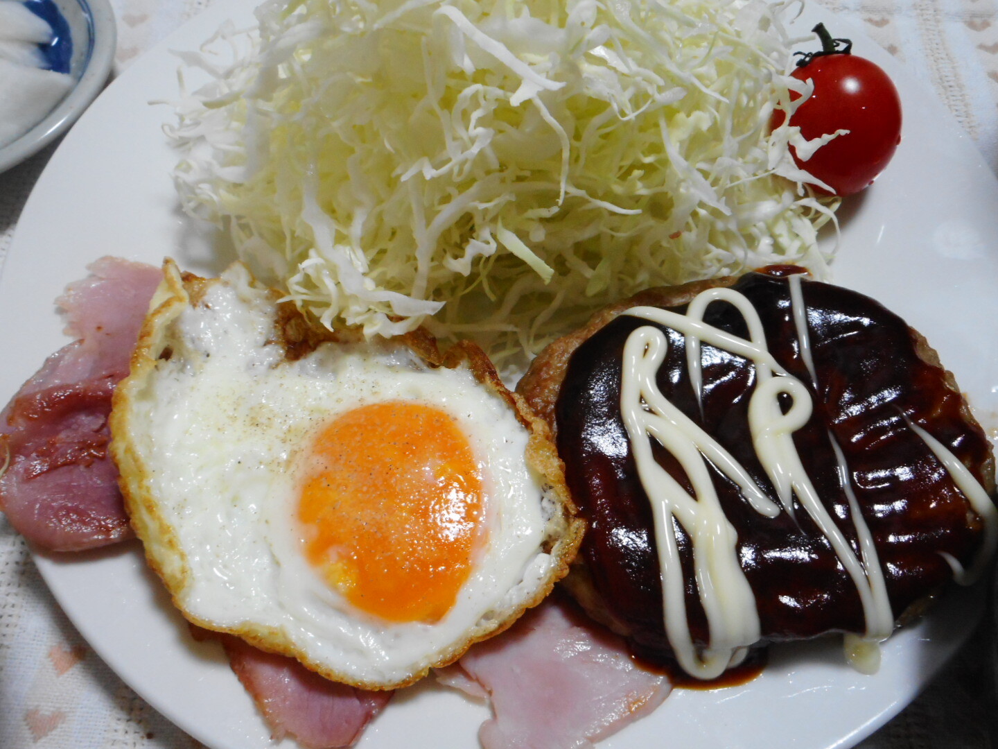 👸姫様のリクエストのとろみを付けるの忘れました、まぁ~いっかwwwメインですね、ハンバーグとハムエッグにしました。