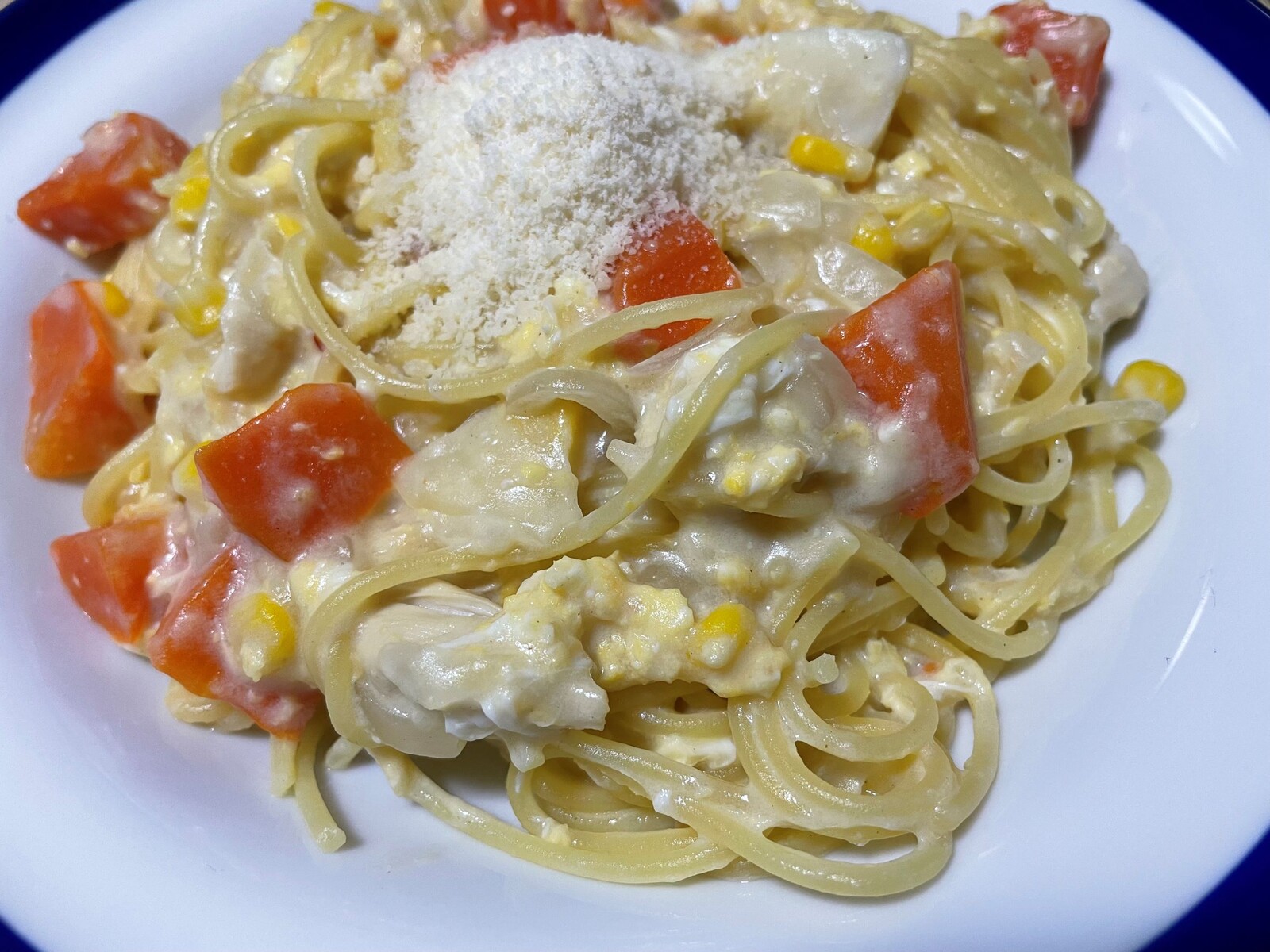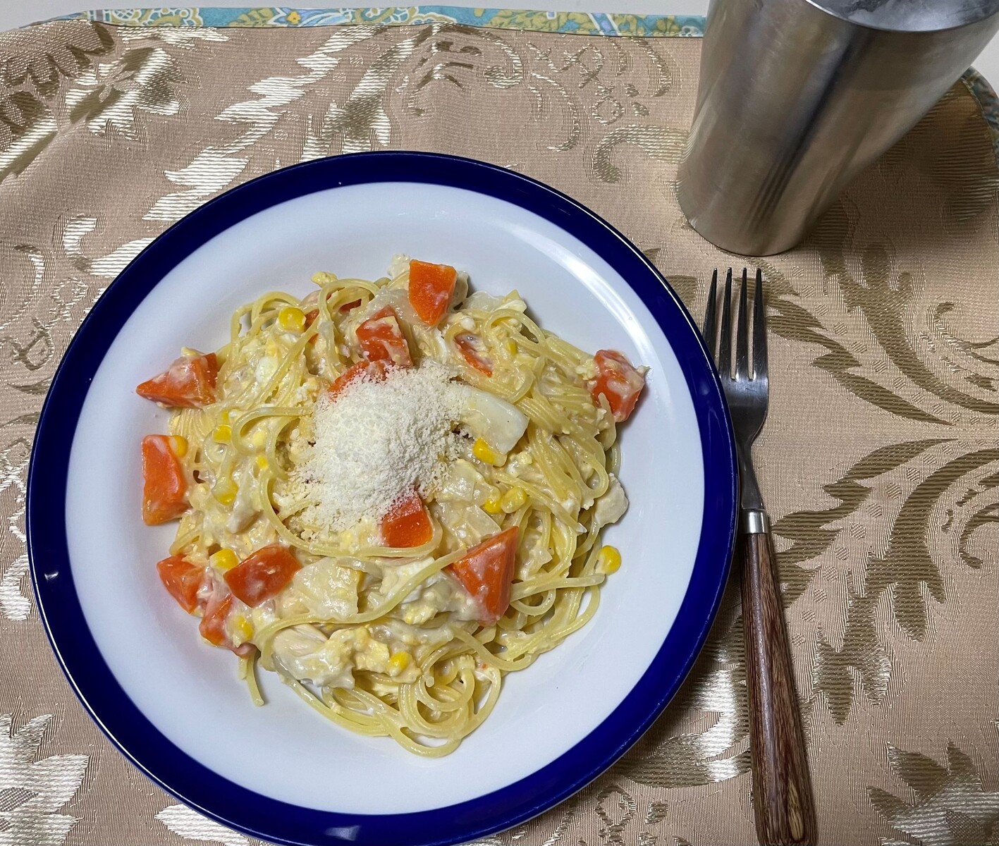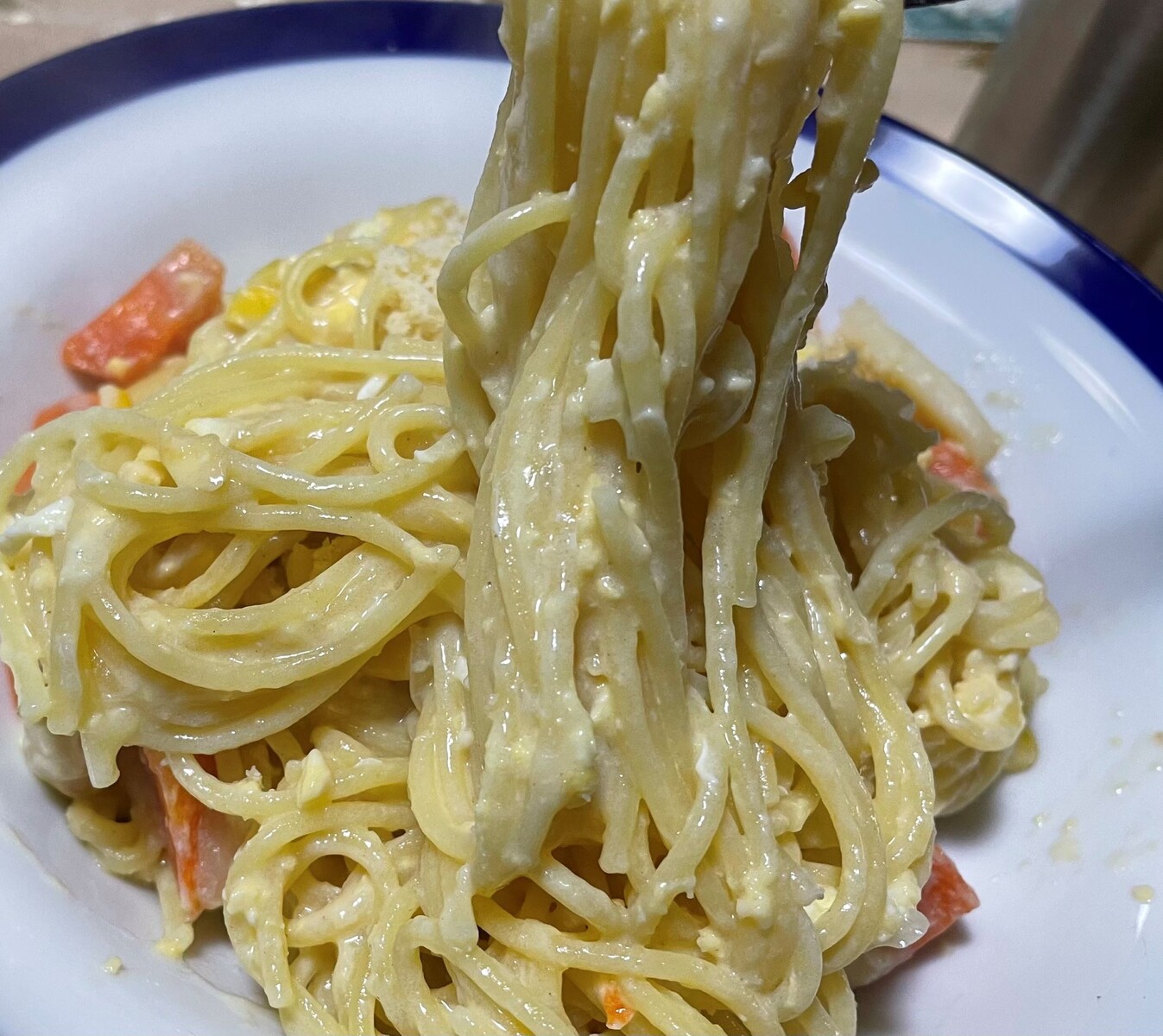 カルボナーラとは言わないけど美味しいパスタの出来上がりでした、大満足しましたよ、酔っていても美味しい物が作れたなんて日記かブログにアップしておこう 森