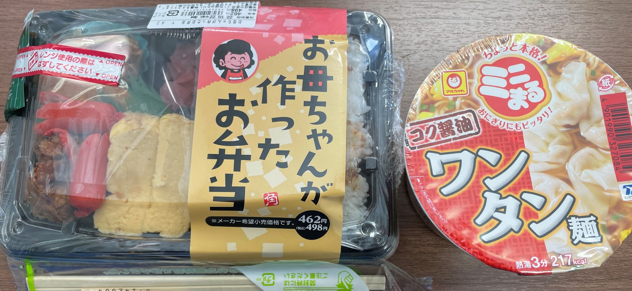 デイリーヤマザキで買った弁当とカップ麺を頂きます