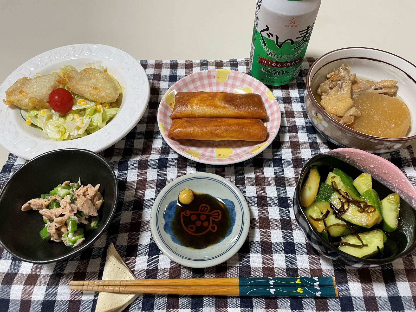 唐揚げは二度揚げの時にもうちょっと揚げてても良かったかな、チキンなハートの🐷ふ~ちゃんは焦げるの恐れて早めに唐揚げを揚げてしまいました、今回はその失敗以外は全然OKです、これもアルコールが進みそう!!