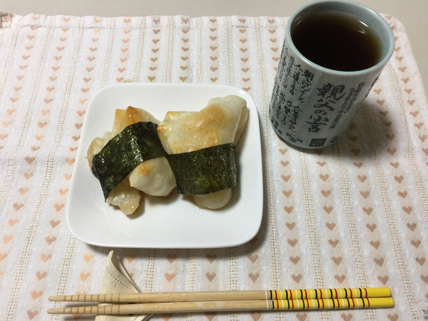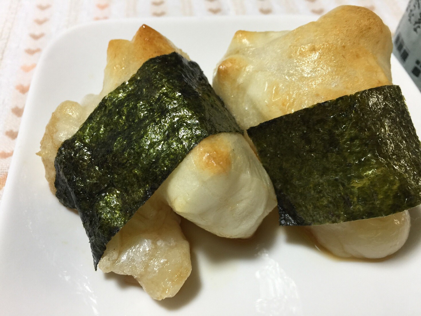 こんがり焼いたお餅に醤油を付けて海苔を巻いたら出来上がりです、簡単なメニューなんですけど、めちゃくちゃ美味しいんですよね!!