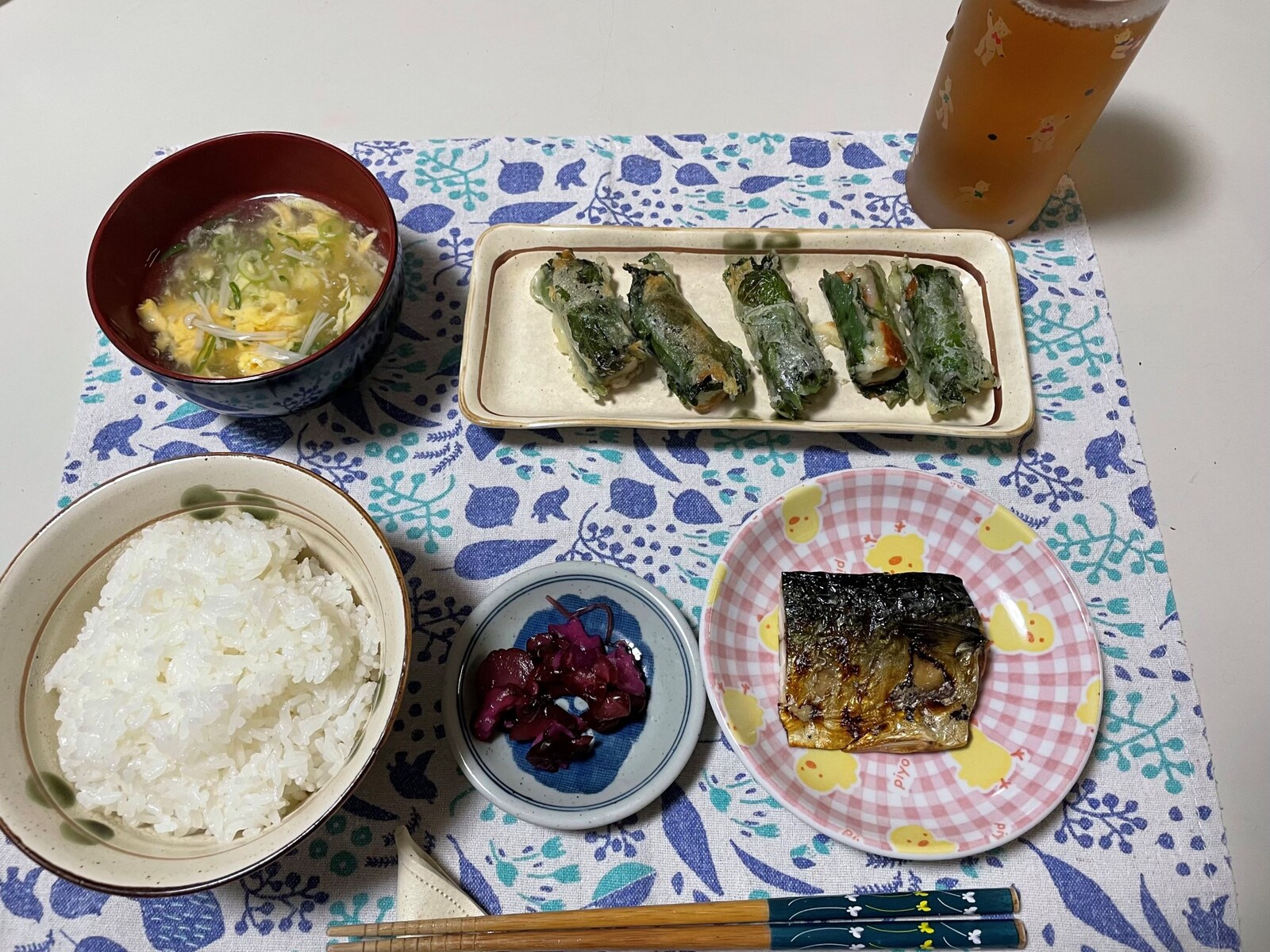 この日の昼食は最近焼き魚を食べてなかったので鯖の塩焼きを用意しました、それとキャベツと塩昆布の和え物に油揚げの味噌汁です、それと👸姫様がのりたまを用意してくれました。